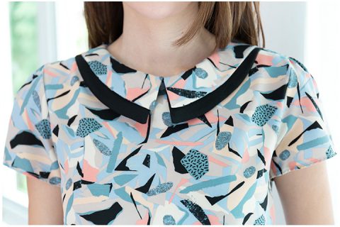 เสื้อทำงานทรงใส่ง่าย ปกบัวตัดปลายแหลม ซ้อนปก 2 ชั้น พิมพ์ลายกราฟิก แขนสั้นต้นแขนแอบจับจีบเบาๆ ด้านหลังผ่าหยดน้ำติดกระดุม ผ้าเนื้อดี นิ่ม ใส่สบาย รีดง่ายดูแลง่ายด้วยค่ะ