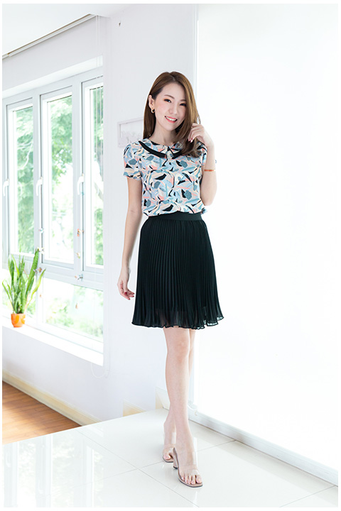 เสื้อทำงานทรงใส่ง่าย ปกบัวตัดปลายแหลม ซ้อนปก 2 ชั้น พิมพ์ลายกราฟิก แขนสั้นต้นแขนแอบจับจีบเบาๆ ด้านหลังผ่าหยดน้ำติดกระดุม ผ้าเนื้อดี นิ่ม ใส่สบาย รีดง่ายดูแลง่ายด้วยค่ะ