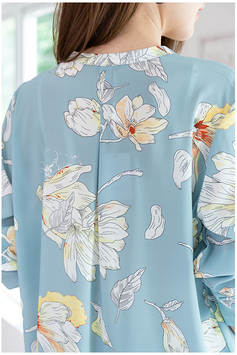 เสื้อสีนุ่มๆพิมพ์ลายดอกไม้ ทรงทูนิค คอจีนผ่าซิปหน้า ขอบคอไม่สูงมากหลังคอจับจีบกลาง แขนยาวติดกระดุมปลายแขน เนื้อชีน่าเนื้อดีมาก ผ้าทิ้งตัวนิ่มและเย็น เนื้อสัมผัสเนียนใส่แล้วรู้สึกเหมือนได้รับการดูแลทะนุถนอมเลย^^ ชายเสื้อโค้งเล็กน้อยใส่ทรงปล่อยแบบหลวม ดูสบายๆค่ะ