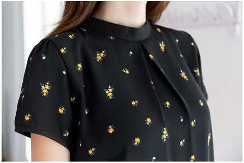 เสื้อชีฟองพิมพ์ลายดอกไม้สีเหลืองเล็กๆทั่วตัว คอตั้ง จับจีบทวิสตรงกลางอก แขนสั้นกุ๊นขอบ ด้านหลังผ่าหยดน้ำติดกระดุมคอ เนื้อผ้านิ่มๆรีดง่าย เนื้อชีฟองทิ้งๆนิดๆสัมผัสผิวแล้วรู้สึกเลอค่า รุ่นนี้ผ้าไม่ได้บางมากเหมือนชีฟองปกติแต่บางช่วงถ้ามีแสงส่องผ่านเนื้อจะดูโปร่งค่ะ ยังแนะนำให้ใส่ซับในเพื่อความเรียบร้อยนะคะ