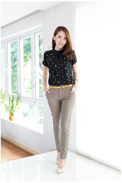 เสื้อชีฟองพิมพ์ลายดอกไม้สีเหลืองเล็กๆทั่วตัว คอตั้ง จับจีบทวิสตรงกลางอก แขนสั้นกุ๊นขอบ ด้านหลังผ่าหยดน้ำติดกระดุมคอ เนื้อผ้านิ่มๆรีดง่าย เนื้อชีฟองทิ้งๆนิดๆสัมผัสผิวแล้วรู้สึกเลอค่า รุ่นนี้ผ้าไม่ได้บางมากเหมือนชีฟองปกติแต่บางช่วงถ้ามีแสงส่องผ่านเนื้อจะดูโปร่งค่ะ ยังแนะนำให้ใส่ซับในเพื่อความเรียบร้อยนะคะ