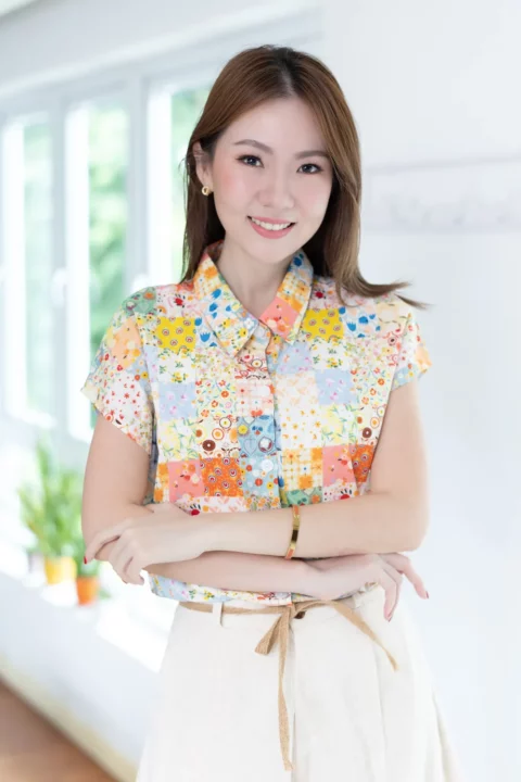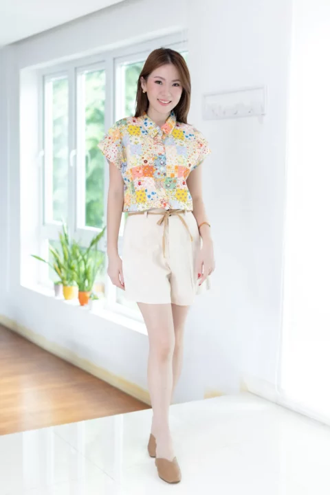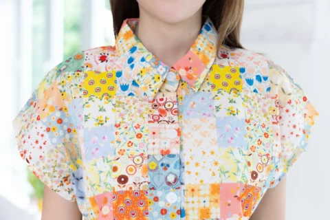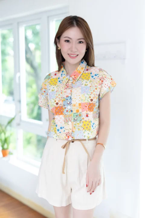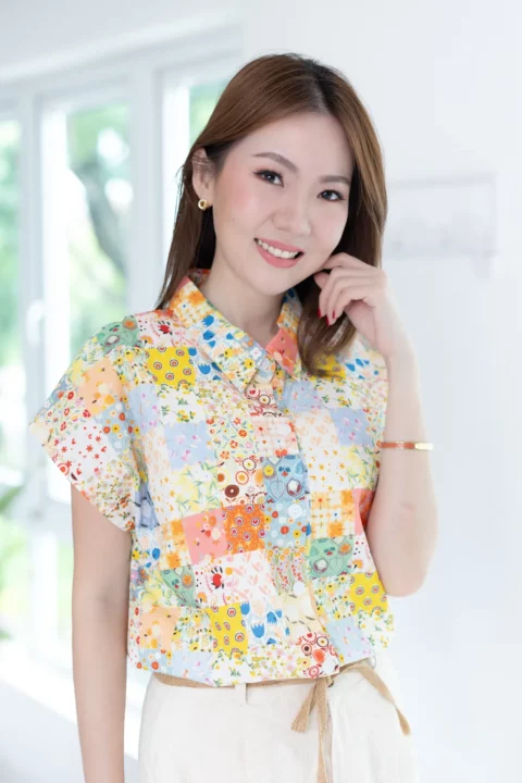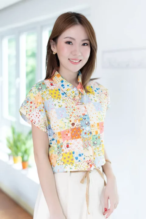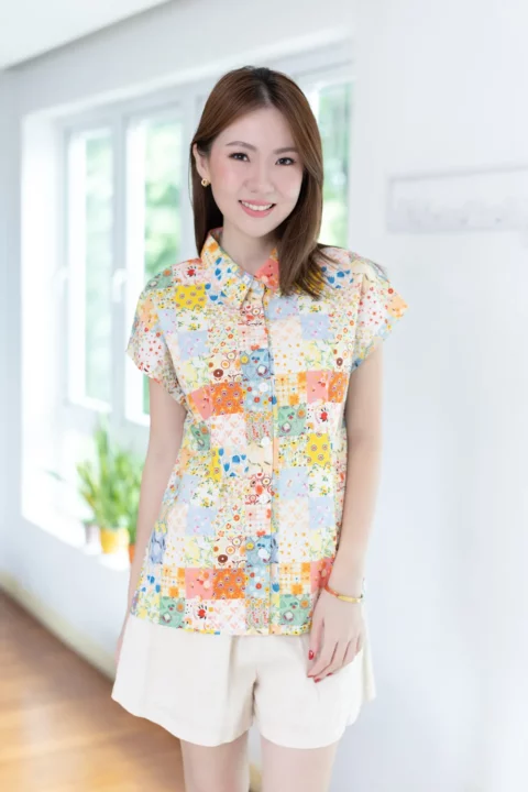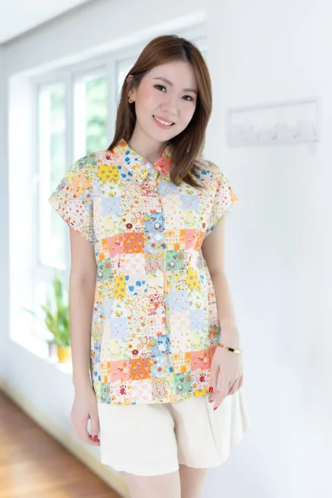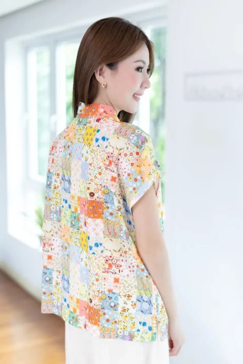 เสื้อคอปกแขนล้ำๆ ทรงสบายๆเหมาะกับวันหยุด ผ่ากระดุมหน้า ตัดเย็บด้วยคอตตอนเนื้อดีพิมพ์ลายดอกไม้ต่อกันด้วยลายเหลี่ยม ใส่ยังไงก็น่ารักอารมณ์ดี
