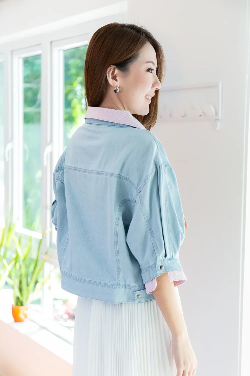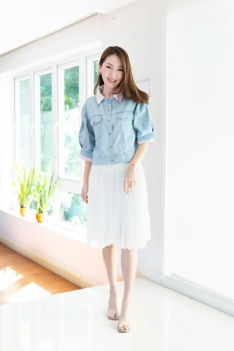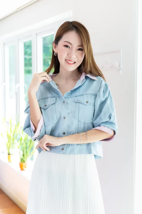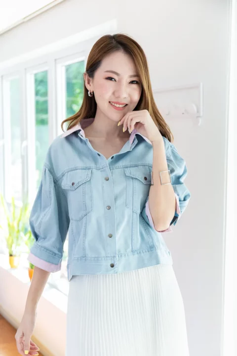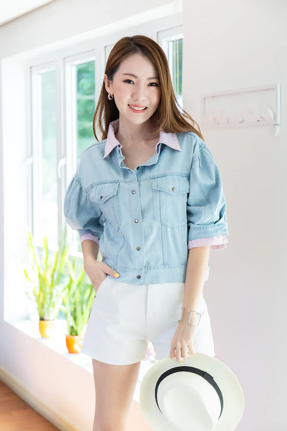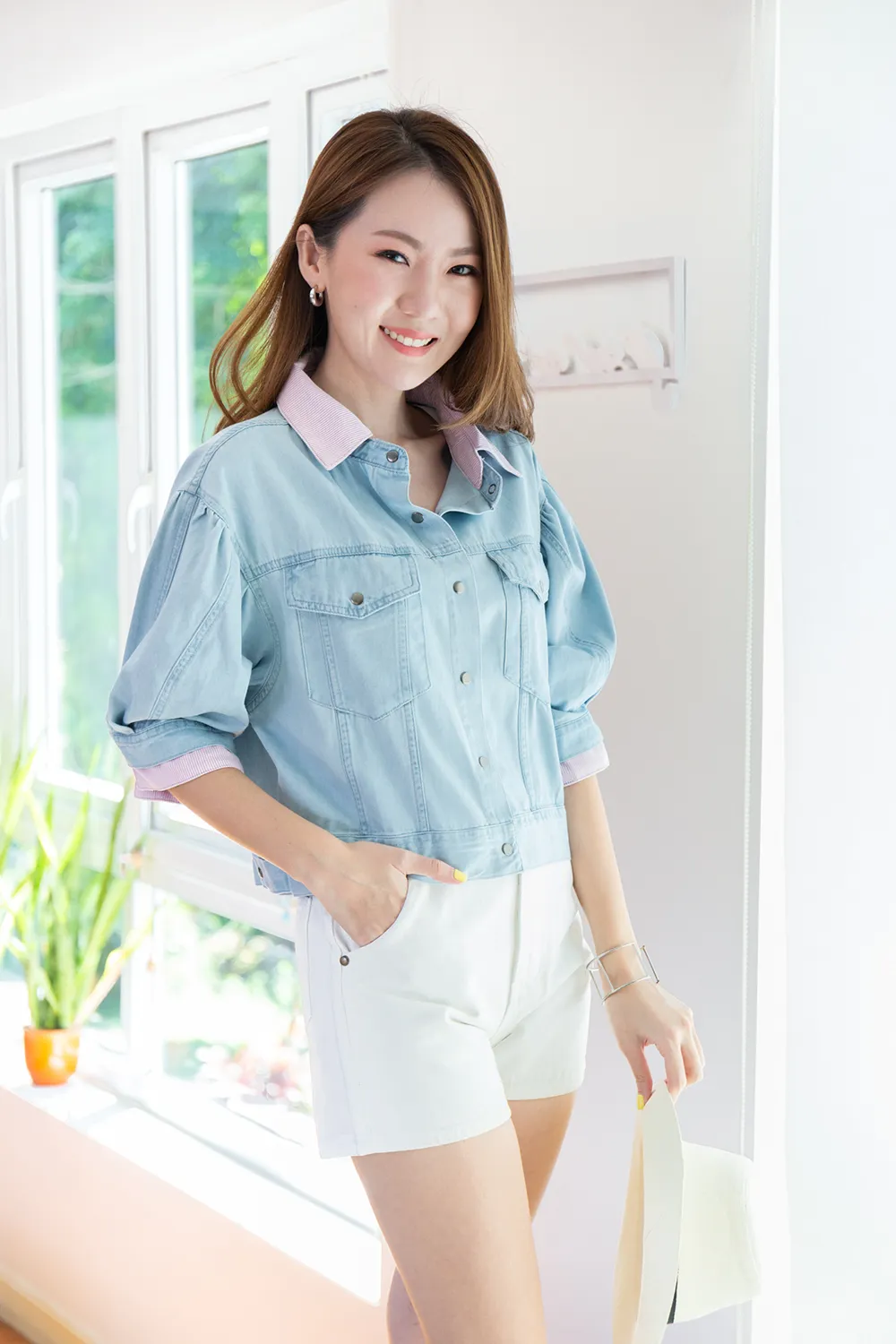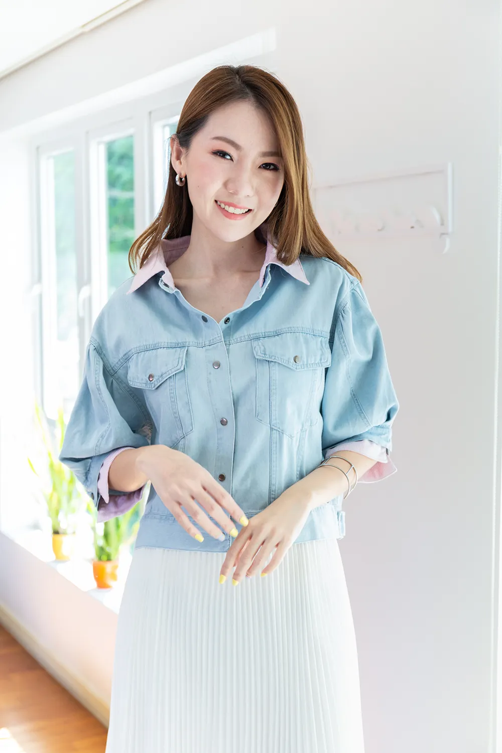 เสื้อคอตตอนเดนิมสีฟอกอ่อนกำลังดี เนื้อไม่หนาใส่สบาย แต่งกระเป๋าจริงด้านหน้า (กระดุมบนฝากระเป๋าจะเป็นกระดุมหลอกนะคะ กระเป๋าใช้งานได้จริงค่ะ) แขนบอลลูนจับจีบหัวไหล่นิดๆ เสื้อทรง Crop สั้น ขอบชายแต่งกระดุม ต่อปกและปลายแขนด้วยผ้าคอตตอนริ้วชมพูอ่อน งานคอนทราสต์ เท่ห์ปนหวาน มีเถอะค่ะ!