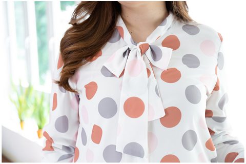 เสื้อแขนยาวเนื้อเนียนๆ ผ้าดีทิ้งตัว ผ่ากระดุมหน้า แต่งสายรอบคอไว้ผูก พิมพ์ลายจุดใหญ่ๆดูสดใสสะอาดตา ทรงสวยเลิศ หวานแบบแอบเรโทรนิดๆ ชอบมาก!