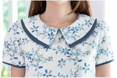 เสื้อลายน่ารักๆ ปกบัวตัดปลายแหลม ซ้อนปก 2 ชั้น ใช้ผ้าพิมพ์ลายดอกไม้ ด้านหลังผ่าหยดน้ำติดกระดุม ผ้าเนื้อดี นิ่ม ใส่ไปทำงานได้น่ารักเลย