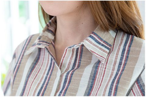 เสื้อเชิ้ตคอปกทรงครอปสั้น ผ่ากระดุมหน้า แขนสั้นทรงสุดชิล ตัดเย็บด้วยผ้าคอตตอนผสมลินิน มี Texture สวย ทอลายริ้วสลับสีน้ำตาลอ่อน-น้ำเงิน-แดง ชายเสื้อโค้งด้านข้างตัวนิดๆ ด้านหน้าสั้นกว่าด้านหลัง ใส่อยู่บ้านก็สวยสบาย หรือวันหยุดแมทช์กับขาสั้นเอวสูง+ผ้าใบซักคู่ ก็ออกนอกบ้านได้ สวยชิลเลย