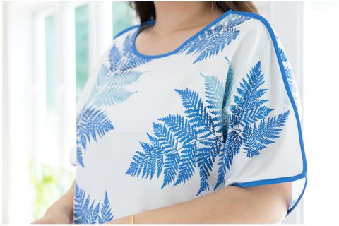 เสื้อลายสวยโดดเด่น ทรงแขนค้างคาวแบบล้ำๆ คอกลมผ่าหยดน้ำหลังติดกระดุม พิมพ์ลายใบเฟิร์นสีสวย กุ๊นขอบรอบตัวด้วยผ้าสีพื้น ใส่ปล่อยๆ Elegant & Chic เว่อร์