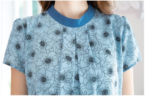 เสื้อคอปิดตั้ง จับจีบทวิสตรงกลางอก แขนสั้น ด้านหลังผ่าหยดน้ำติดกระดุมคอ ลายพิมพ์ลายเส้นดอกไม้รุ่นนี้สวยเก๋ เนื้อผ้านิ่มๆรีดง่าย แค่แมทช์กับชิ้นล่างแบบเรียบๆก็สวยโดดเด่น