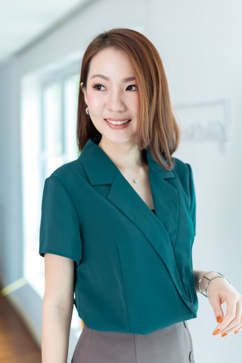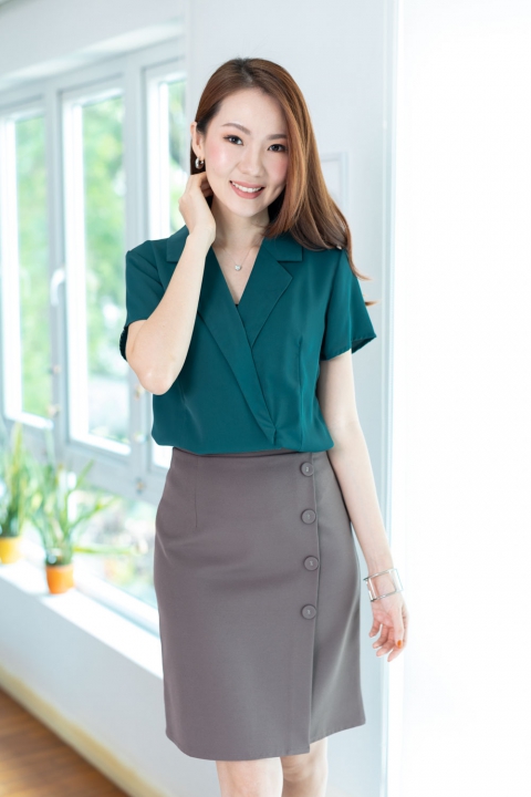 เสื้อทรงสวย Smart & Classy คอปกเทเลอร์ ซ้อนด้านหน้านิดนึงเป็นคอวีทรงกึ่งๆป้ายหลอก แอบติดกระดุมแป๊กกันเปิดด้านหน้า เสื้อตีเกล็ดเข้ารูปเข้าทรงตรงเอวสูง ใส่แล้วดูผอม แขนสั้น ดีไซน์สวยหรูค่า