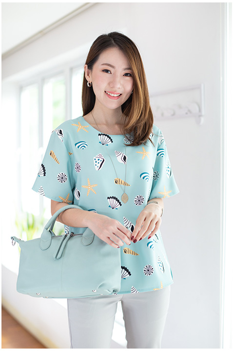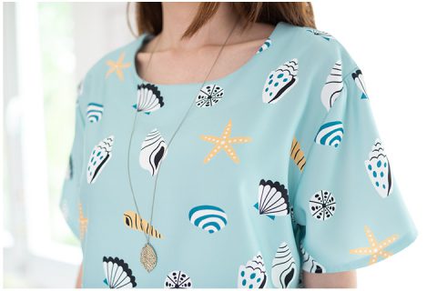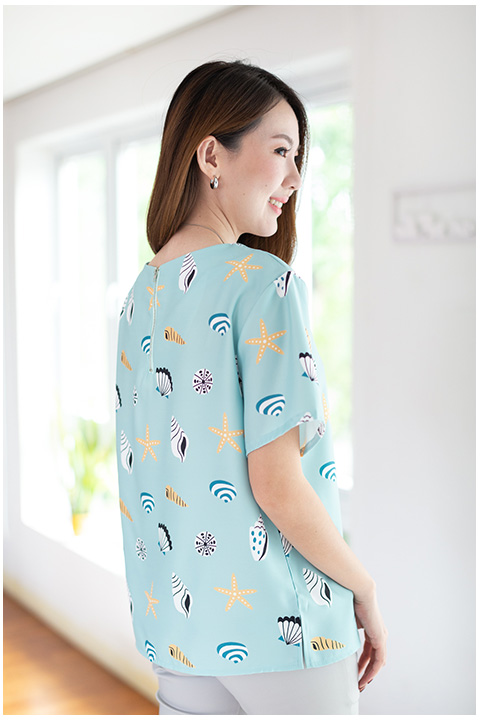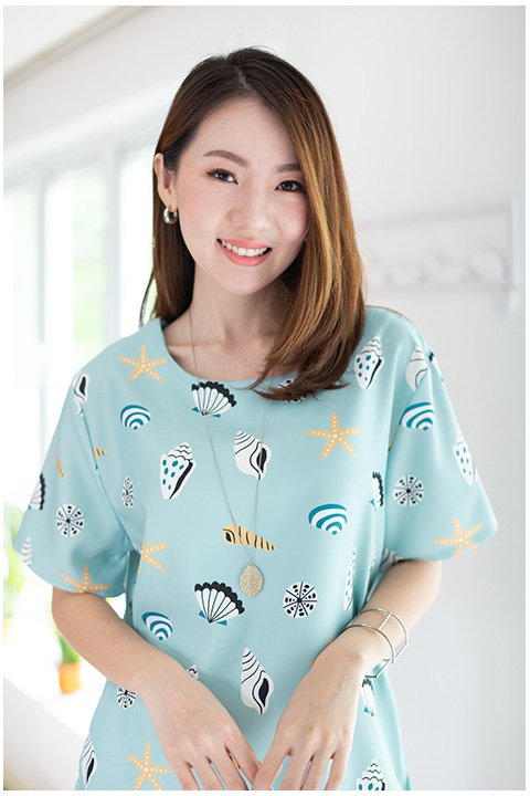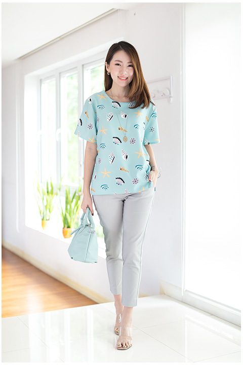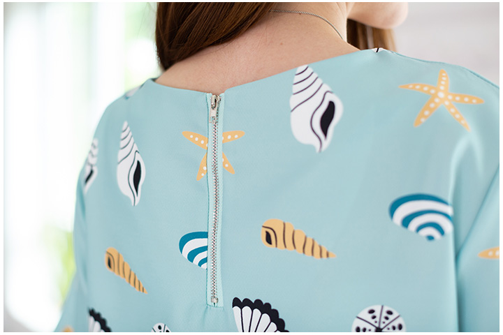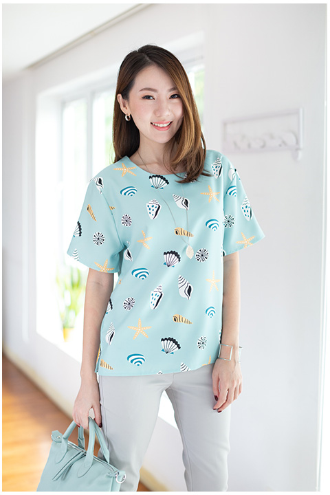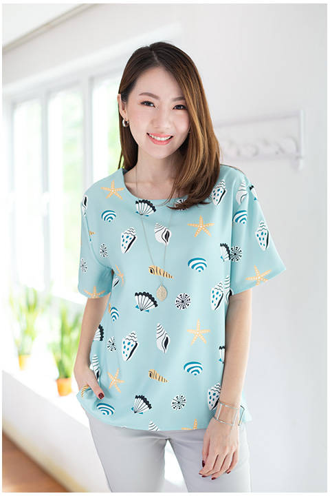 เสื้อคอกลม แขนสั้น แบบสวม ทรงปล่อยไม่เข้ารูปมาก ตัดเย็บด้วยผ้าโพลีเอสเตอร์ผสมเนื้อดี ชายเสื้อผ่าข้างขึ้นมาสั้นๆ ใส่ปล่อยชายเสื้อได้เลย ผ้าพิมพ์ลายเปลือกหอยและปลาดาว สีสวยหวานๆคลีนๆ ใส่ง่ายอารมณ์ดี