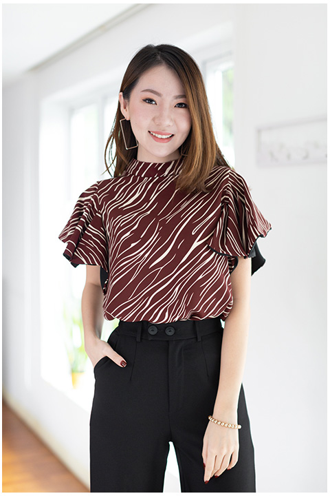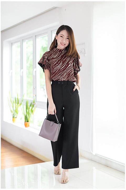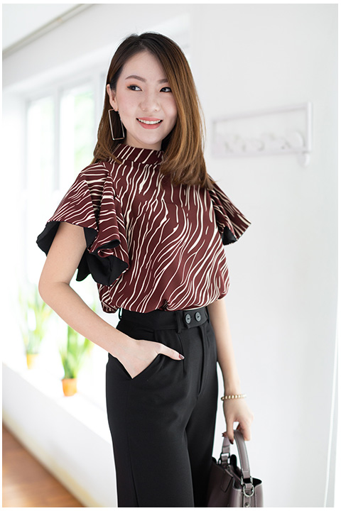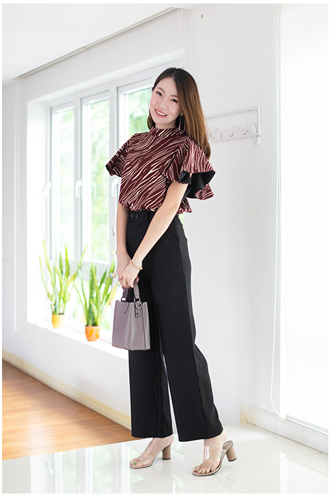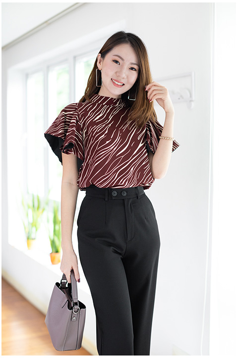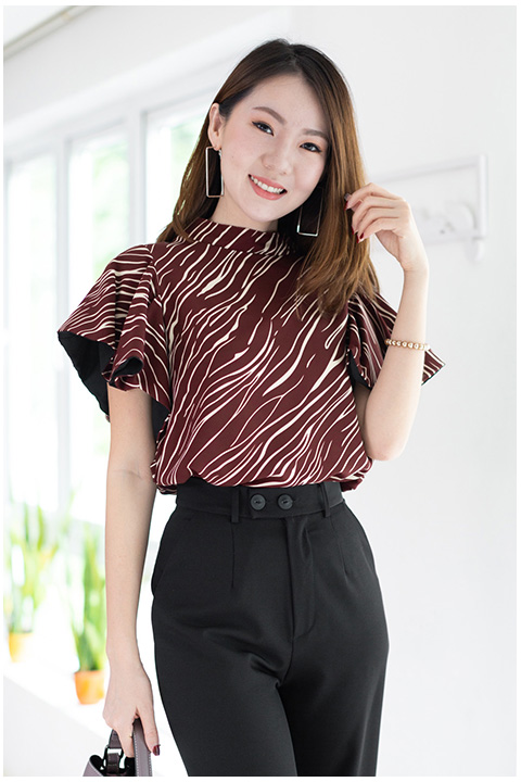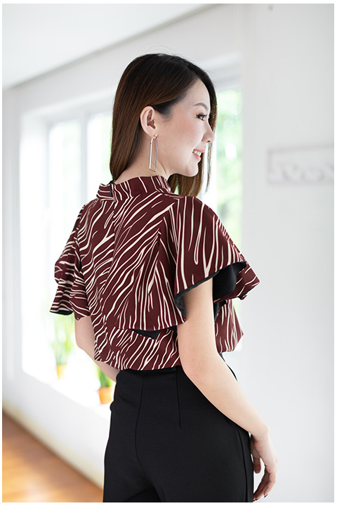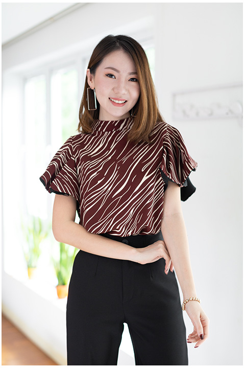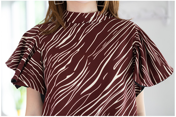 เสื้อทรงโดดเด่น สวยเข้มๆ คอตั้งๆไม่แคบมาก แขนทรงผีเสื้อปล่อยพลิ้วๆ แอบเก๋มีดีเทลซ้อนผ้าสีพื้นด้านในแขนด้วยผ้าจอร์เจีย วงแขนกว้าง ด้านหลังผ่าซิปซ่อน ใช้ผ้าอิตาลีพิมพ์ลายกราฟิกแดงเข้มๆ ใส่สวยขับผิวเลย