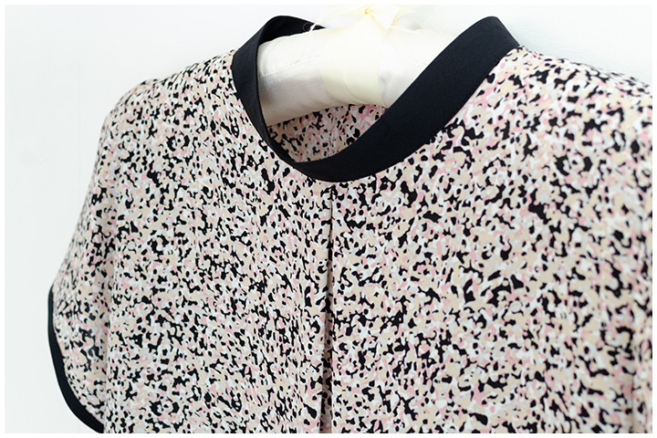 เสื้อสีสวย คอตั้ง จับจีบ Twist ตรงกลางอก แขนสั้นกุ๊นขอบ ด้านหลังผ่าหยดน้ำติดกระดุม ตัดเย็บด้วยผ้าชีน่าเนื้อเนียน ทิ้งตัวนิดๆ นิ่มลื่นมากเลย พิมพ์ลายกราฟิก ลายจิ๋วๆ สวยเก๋ค่ะ