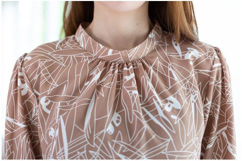 เสื้อโทนสีน้ำตาลสวย ทรงคอปิดตั้งนิดๆจีบรูดใต้คอ แขนยาว 4 ส่วน จั๊มยางยืดปลายแขน ด้านหลังติดกระดุมคอผ่าหยดน้ำ ใส่สวยแบบเรียบร้อยและคลาสสิค