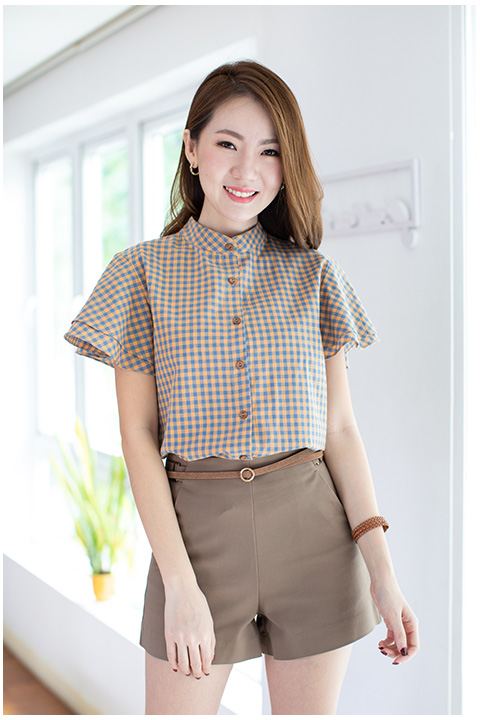 NT2318 Butterfly Sleeve Checkered Shirt – Orange