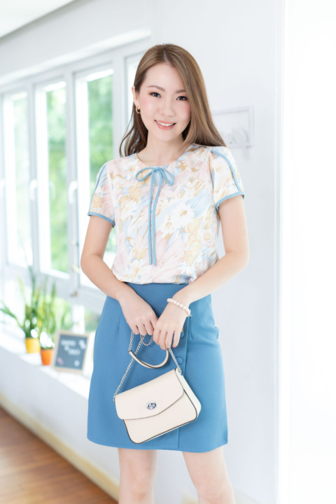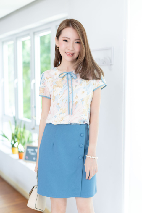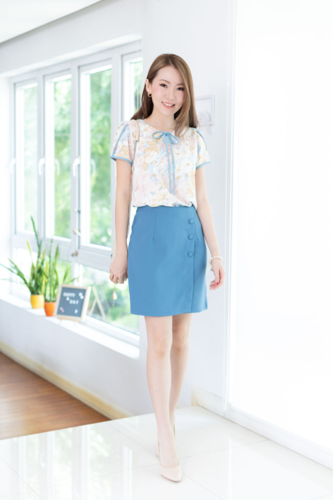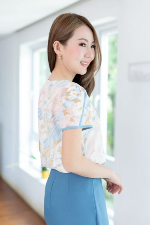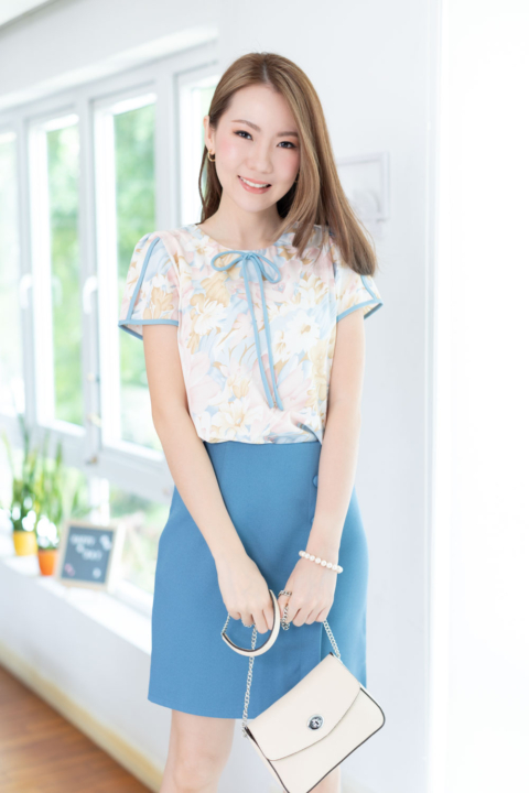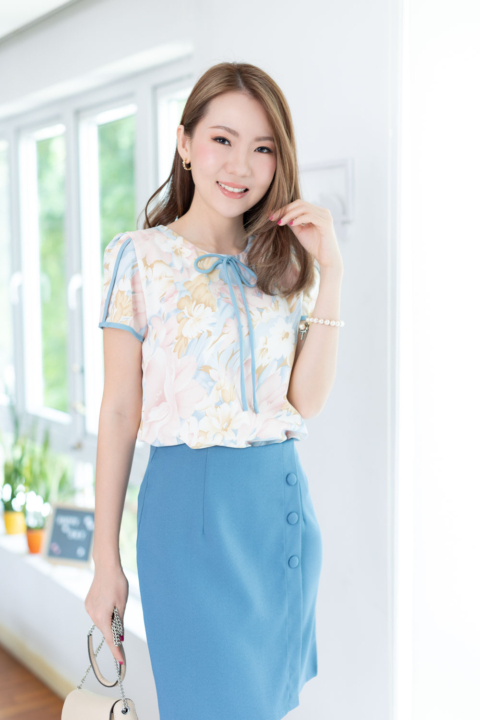 เสื้อทำงานผ้านิ่มสบาย เนื้ออิตาลีที่ทุกคนคุ้นเคย มาในลายพิมพ์ดอกไม้แบบหวานเบาๆ คอกลมแต่งสายโบว์ด้านหน้า แพทเทิร์นแอบคอดใต้อกนิดๆด้วยค่ะ ตัวแขนรุ่นนี้จับซ้อนทรงกลีบดอกไม้ กุ๊นตัดขอบสีพื้นทำให้ดูเด่นขึ้นมา เวลาใส่ก็จะน่ารักประมาณนี้เลยค่า ใส่คู่กระโปรงก็ส่งให้ดูหวานเข้ากัน ใส่คู่กางเกงผ้าสีพื้นก็ Elegant ค่ะ