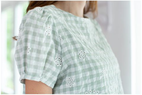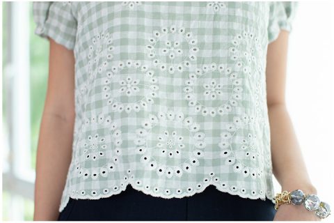 เสื้อครอปทรงคิ้วท์ คอกลม ทรงพอดีตัว ดีเทลผ่ากระดุมด้านหลังยาว แต่งแขนตุ๊กตาจับจีบปลายแขนดูเป็นทรงกระเปาะเล็กๆน่าเอ็นดู เนื้อผ้าคอตตอนลายตารางสีหวานๆ ปักฉลุลายดอกไม้ เน้นงานช่วงปลายชายเสื้อเป็นชายหยัก Scallop มาพร้อมซับในเต็มตัว