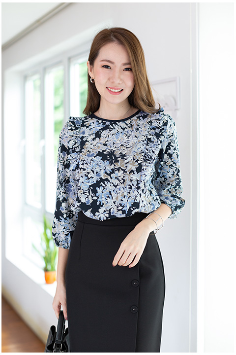 เสื้อแขน 4 ส่วน ผ้าพีชสกินนิ่มลื่น ผ้าพิมพ์ลายดอกไม้สีเข้ม คอกลมกุ๊น ตีเกล็ดยาวแต่งระบายสั้นด้านหน้า ปลายแขนจั๊มยางยืด ผ่าหยดน้ำหลังคอ ลายสวยงามม ทรงดีงามใส่สวยเพรียว