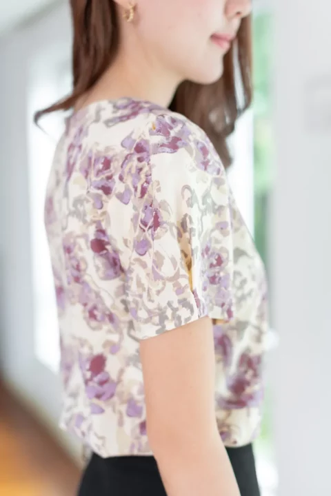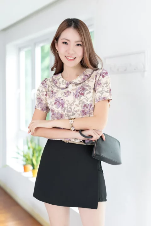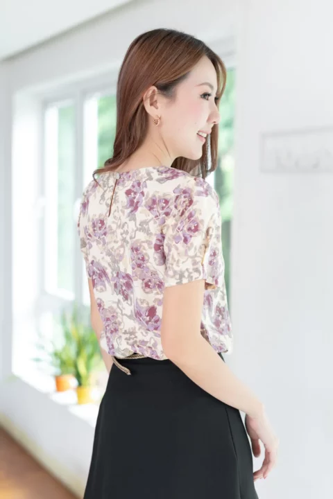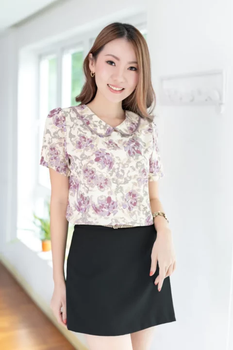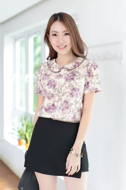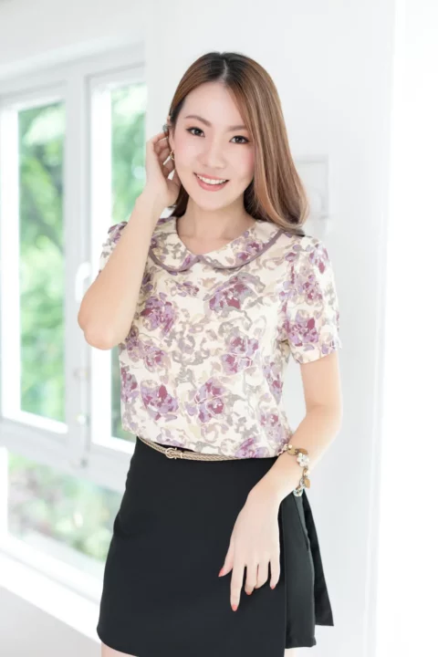 เสื้อทำงาน ผ้าไหมอิตาลีเนื้อนิ่มม ลายดอกไม้สวยงาม แต่งปกบัวกุ๊นขอบวางซ้อนนิดๆ แขนสั้นจีบปลายเบาๆ ผ่าหลังคอสั้นติดกระดุมสวมใส่สะดวก สีนี้สวยมากกก มาแบบนุ่มๆ
