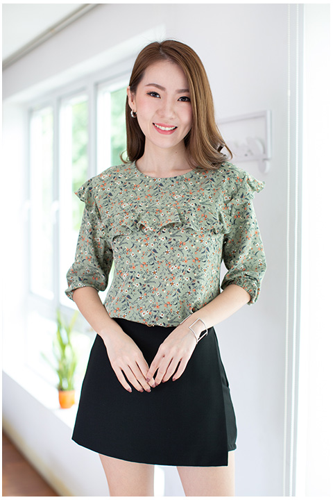 เสื้อสีสวย มาในลายพิมพ์ดอกไม้ สวยหวานเพิ่มขึ้นอีกเลเวลด้วยดีเทลระบายสั้น ที่หัวไหล่และด้านหน้า แขน 4 ส่วน จั๊มยางยืดปลายแขน ทรงนี้ต้องมีติดตู้เพราะใส่ง่าย สวยสุภาพ สีสวย ผ้าดีอีกด้วยนะคะ