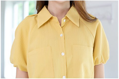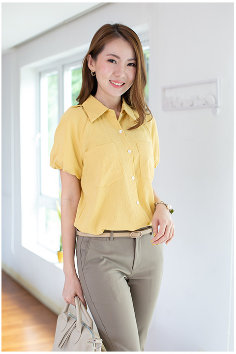 เชิ้ตที่น่ารักที่สุดดด โดดเด่นด้วยผ้าอัดย่นลายเปลือกไม้ ต่อแขน Raglan ปลายแขนบอลลูนจั๊มยางยืด คอปกผ่าหน้า พร้อมกระเป๋าจริง น่ารักขยี้ใจใช่เลย!