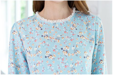 เสื้อทำงานแนวหวานๆแต่งผ้าลูกไม้เนื้อนิ่มที่คอและปลายแขน เสื้อสีสวยพิมพ์ลายดอกไม้ แขนสี่ส่วน จั๊มปลาย งานดูนุ่มนวล สวยหวานเต็มสิบไปเลยค่า