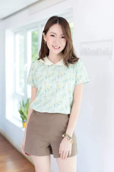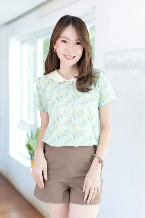 เสื้อคอวีแต่งปกขอบหยักโค้งๆ ขอบปกสีพื้น ตัวเสื้อพิมพ์ลายดอกทิวลิป ลายสวยมาาาก น่ารักถูกใจ ด้านหลังผ่าหยดน้ำติดกระดุมคอ เนื้อผ้าดี๊ดี นิ่มๆ ใส่สบายไม่ร้อน