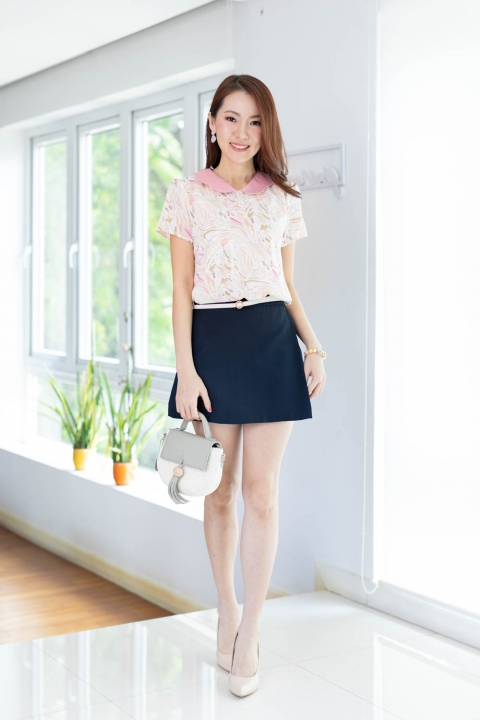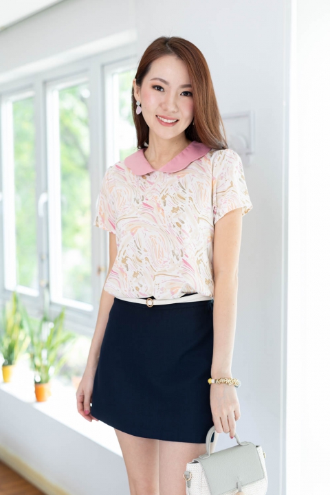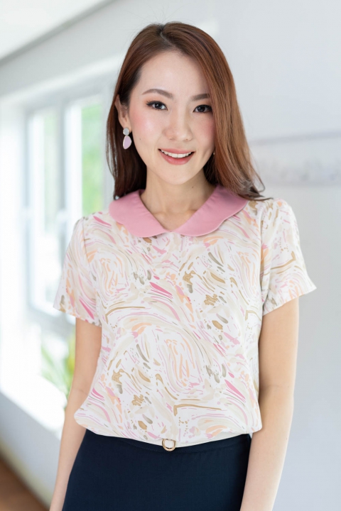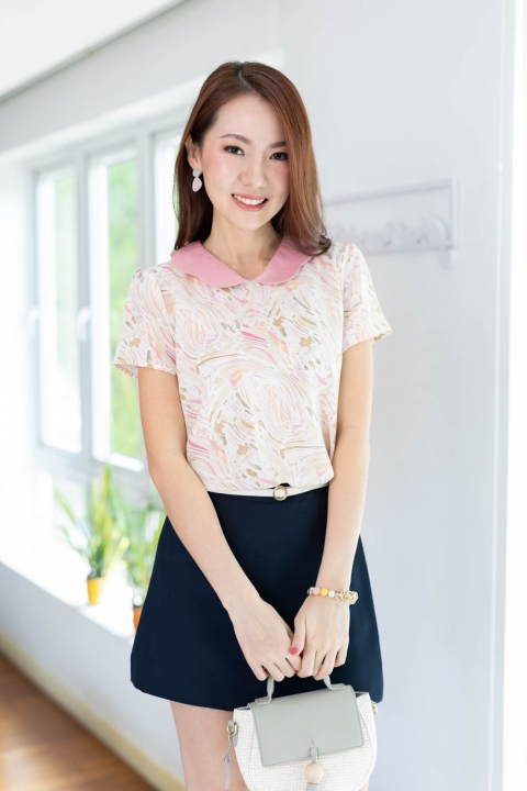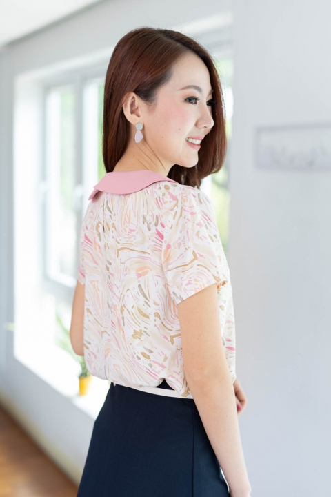 เสื้อคอวีแต่งปกขอบหยักโค้งๆ ขอบปกสีพื้นตัวเสื้อพิมพ์ลายกราฟิก ด้านหลังผ่าหยดน้ำติดกระดุมคอ เนื้อผ้าดี๊ดี นิ่มลื่น ใส่สบายไม่ร้อน รีดง่ายมากด้วยนะคะ