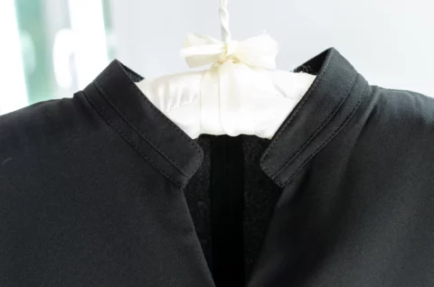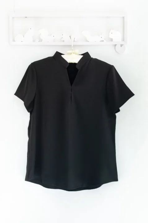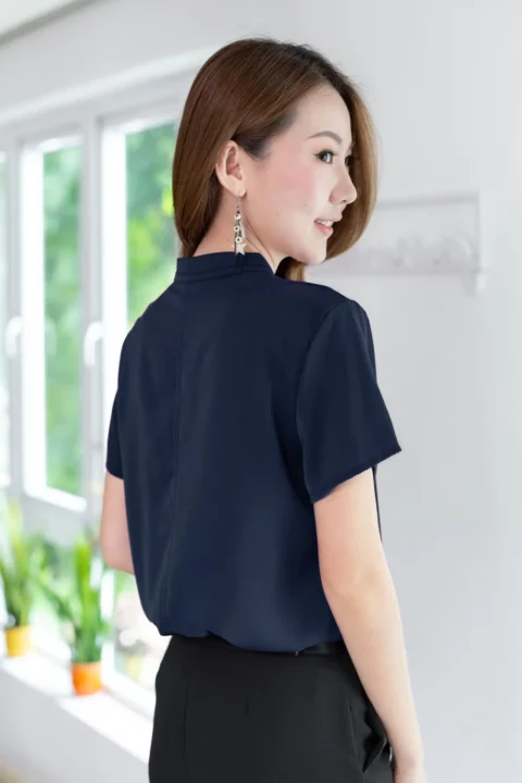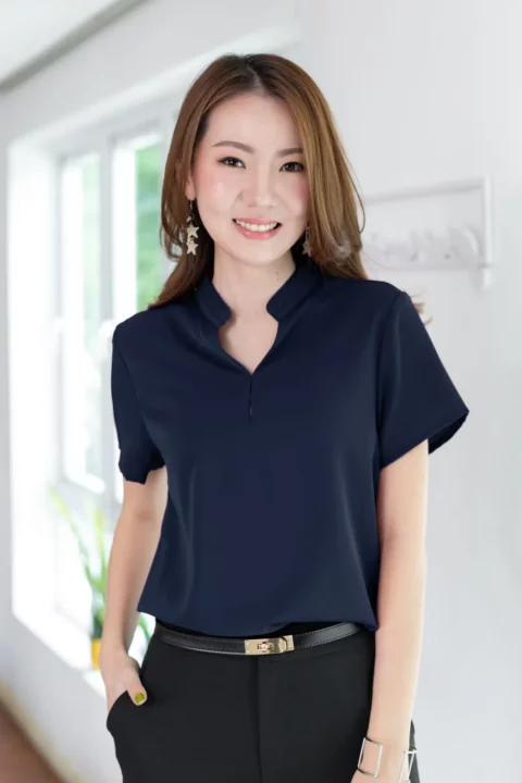 เสื้อคอจีนตั้ง เก๋กรุบกับดีเทลเบิ้ลขอบคอ ส่วนด้านหน้าผ่าวีแบบแคบๆ ทรงเสื้อมีคอดใต้อกเล็กน้อยเพิ่มความสวยเพรียว รุ่นนี้แขนสั้น เป็นแบบสวม เนื้อทิ้งตัวทรงงามมากๆ ใส่ขึ้นมาดูดีราศรีจับเลย