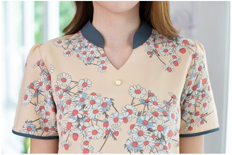 เสื้อทำงานสวยเก๋ แต่งขอบคอสีพื้น ผ่าวีสั้นๆด้านหน้า ตัวเสื้อเป็นผ้าอิตาลีเนื้อนิ่มลื่น แขนสั้นกุ๊นขอบแขน ด้านหน้าแต่งกระดุมสีขาวมุกเม็ดกลม ผ้าพิมพ์ลายดอกไม้ รุ่นนี้ทรงจะคอดเอวนิดนึง ใส่สวยเพรียวค่ะ