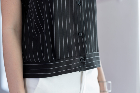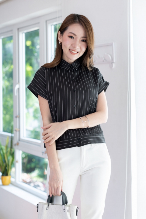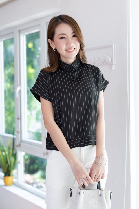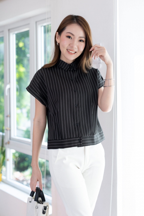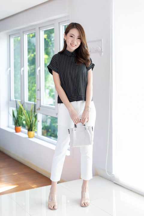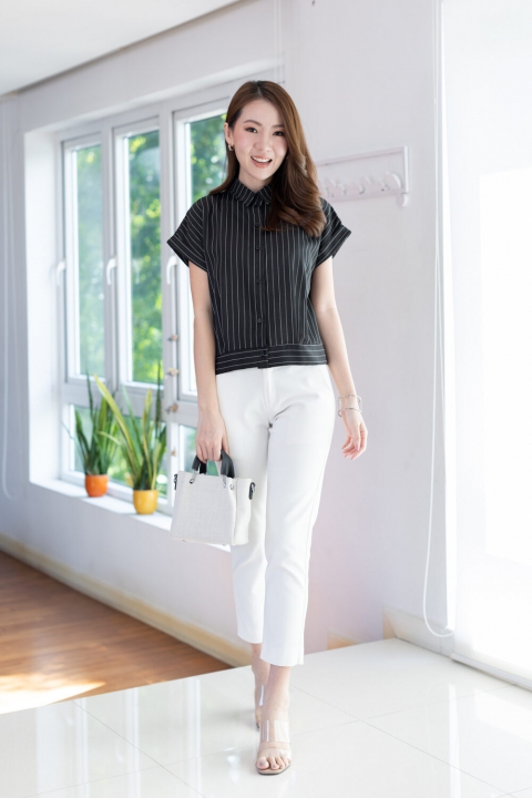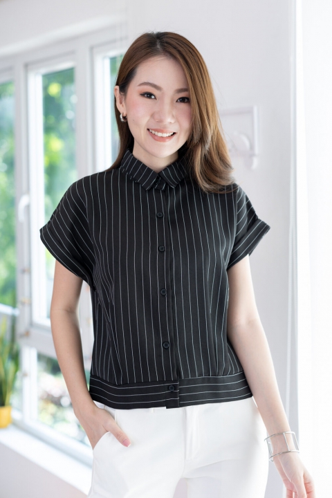 ครอปเชิ้ตแขนล้ำ ทรงสั้นๆน่ารักกรุบกริบ คอปกผ่ากระดุมหน้ายาว แขนเสื้อพับเบิ้ลแล้วเย็บฟิกซ์ เท่ห์แบบเรียบง่าย ผ้าเนื้อดีไม่หนามาก แต่ไม่บางเกินไปค่ะ