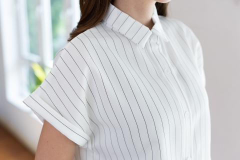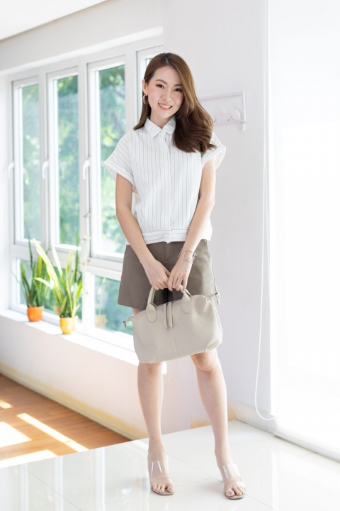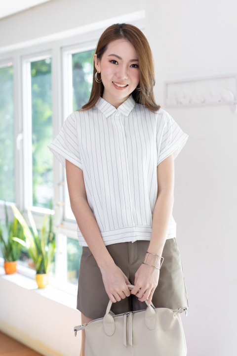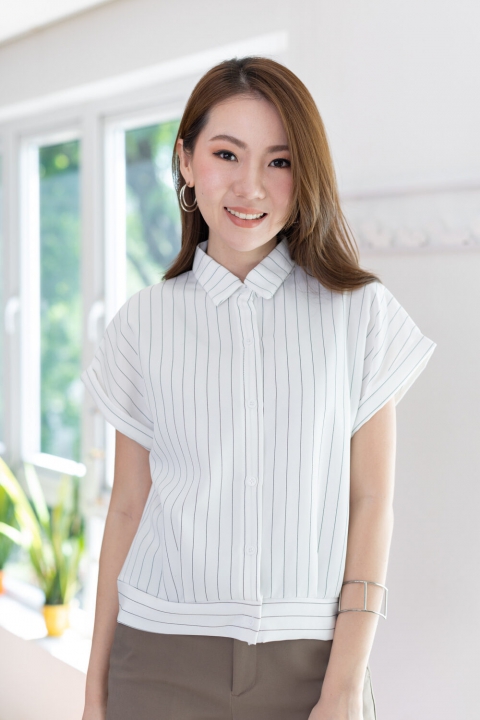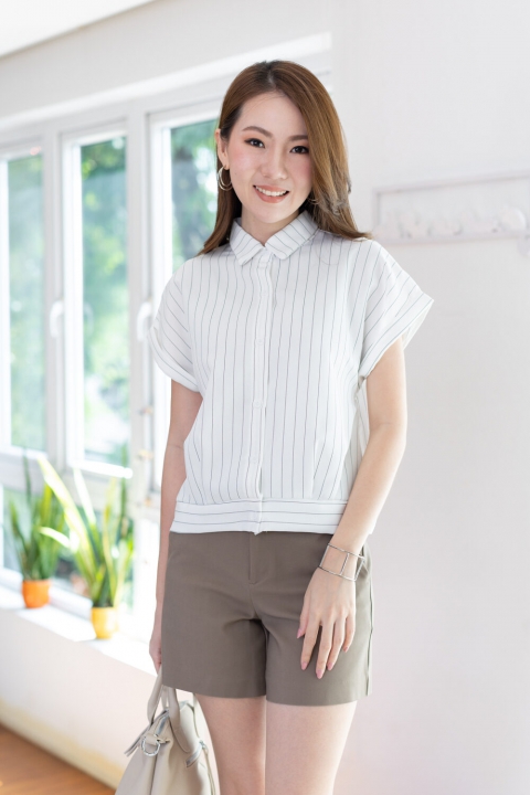ครอปเชิ้ตแขนล้ำ ทรงสั้นๆน่ารักกรุบกริบ คอปกผ่ากระดุมหน้ายาว แขนเสื้อพับเบิ้ลแล้วเย็บฟิกซ์ เท่ห์แบบเรียบง่าย ผ้าเนื้อดีไม่หนามาก แต่ไม่บางเกินไปค่ะ