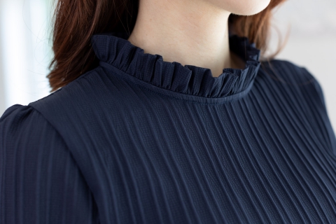 เสื้อทรงสบาย แขนสี่ส่วนจั๊มปลายแขน คอกลมแต่งระบายจีบตั้ง ด้านหลังผ่าหยดน้ำติดกระดุม ใช้ผ้าอัดลายริ้ว เป็น Texture ยาวลงมา เนื้อนิ่มใส่สบายค่ะ