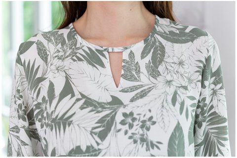 เสื้อแขนสี่ส่วน ทรงสบาย จั๊มปลายแขน คอกลมกุ๊นขอบพร้อมดีเทลผ่าสามเหลี่ยมใต้คอ ด้านหลังผ่าหยดน้ำติดกระดุม แพทเทิร์นคอดเข้ารูปนิดๆ ผ้าพิมพ์ลายใบไม้ดอกไม้ รุ่นนี้พิเศษที่เนื้อผ้าโพลีเอสเตอร์ผสมทอลายสลาฟ ผ้าไม่หนามาก เนื้อผ้าไม่แข็ง เนื้อนิ่มใส่สบายค่ะ