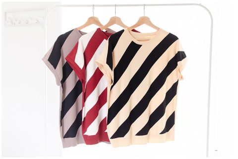 เสื้อไหมพรมนุ่ม ทรงแขนล้ำ ด้านหน้าทอลายริ้วใหญ่แนวเฉียง ด้านหลังเบรคด้วยสีพื้น แต่งจั๊มชายเสื้อ ทรงหลวมสบาย ผ้าไม่หนามาก แต่ไม่บางเกิน ห้องแอร์กำลังดี ผ้านิ่มใส่สบาย