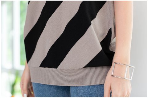 เสื้อไหมพรมนุ่ม ทรงแขนล้ำ ด้านหน้าทอลายริ้วใหญ่แนวเฉียง ด้านหลังเบรคด้วยสีพื้น แต่งจั๊มชายเสื้อ ทรงหลวมสบาย ผ้าไม่หนามาก แต่ไม่บางเกิน ห้องแอร์กำลังดี ผ้านิ่มใส่สบาย