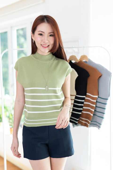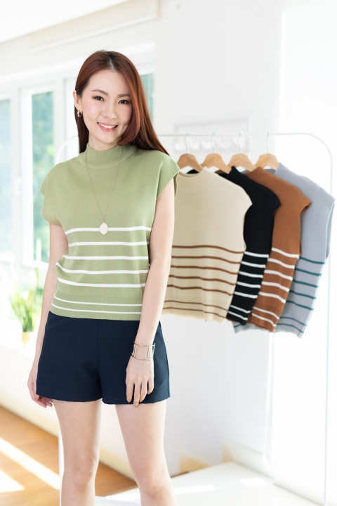 เสื้อไหมพรมเนื้อดี ทรงแขนล้ำ คอปีนๆ ทอลายริ้วขวาง ทรงเสื้อไม่ยาวมากจั๊มชายเสื้อ ใส่เดี่ยวๆหรือเพิ่มเสื้อคลุมอีกตัว สวยเก๋เลยค่า
