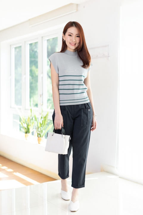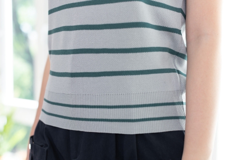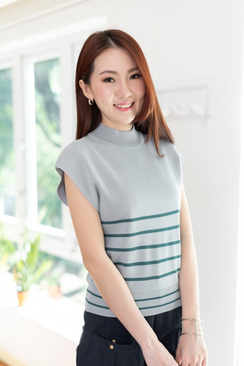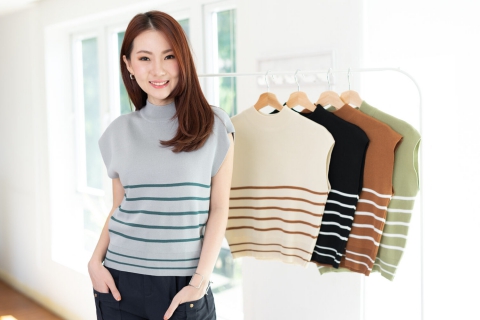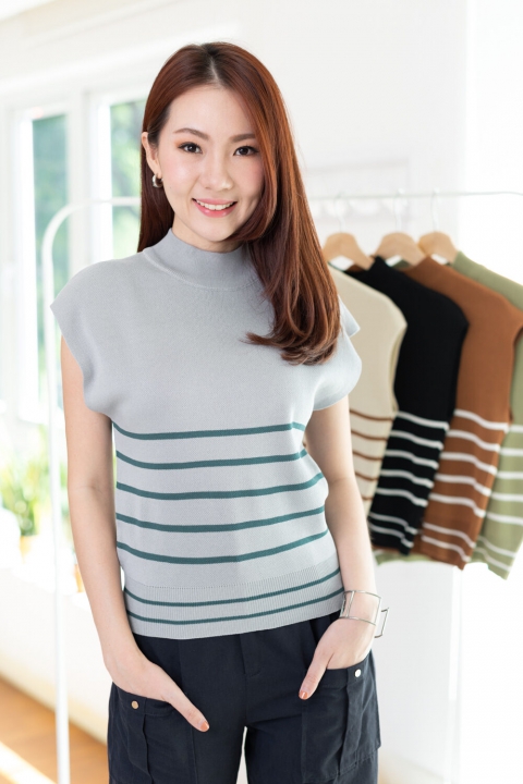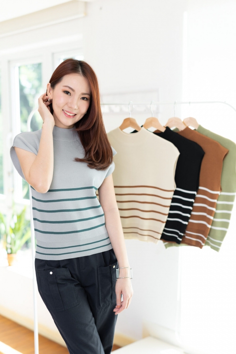 เสื้อไหมพรมเนื้อดี ทรงแขนล้ำ คอปีนๆ ทอลายริ้วขวาง ทรงเสื้อไม่ยาวมากจั๊มชายเสื้อ ใส่เดี่ยวๆหรือเพิ่มเสื้อคลุมอีกตัว สวยเก๋เลยค่า