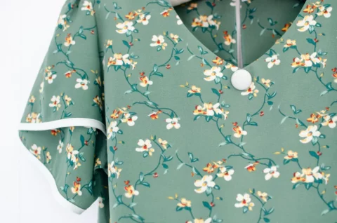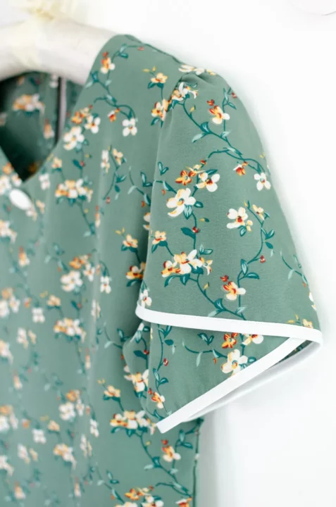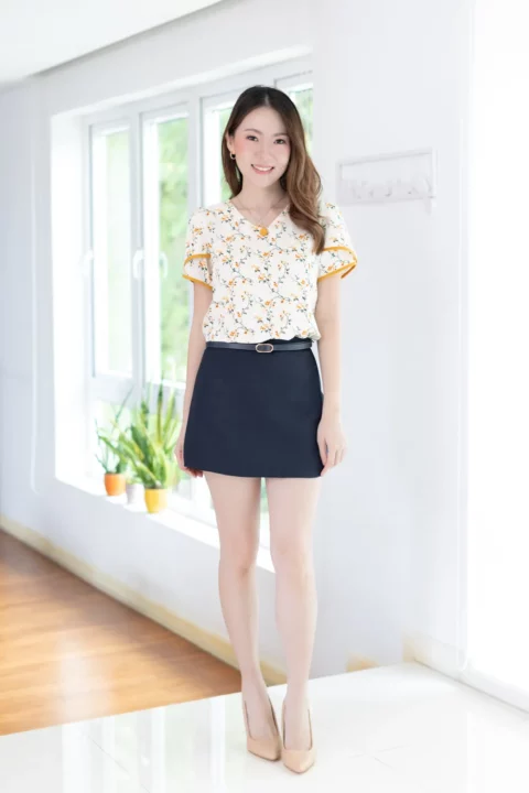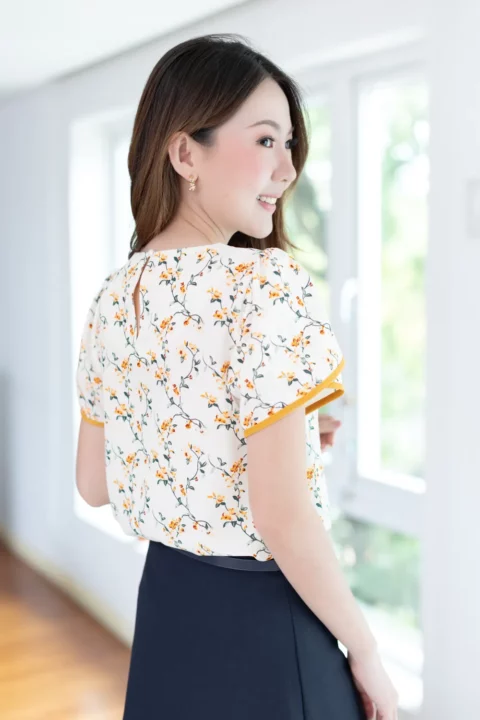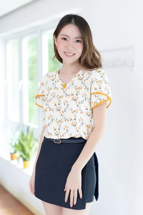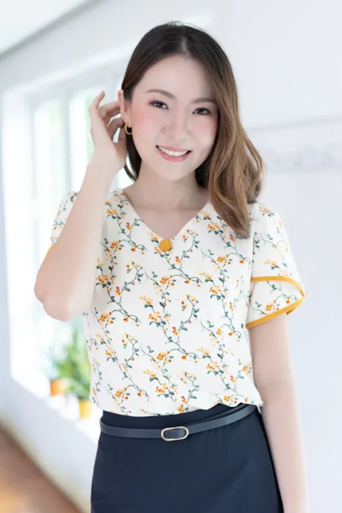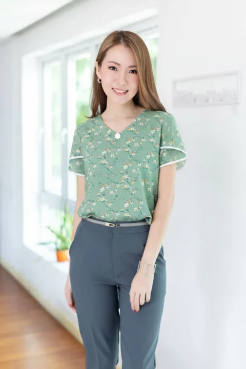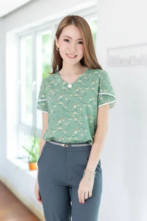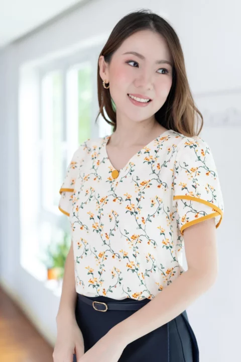 เสื้อทำงานคอวีแบบป้านโค้งๆ แต่งกระดุมปั๊ม 1 เม็ดด้านหน้า แขนสั้นซ้อนกุ๊นปลายแขนสีพื้น ด้านหลังผ่าหยดน้ำติดกระดุมคอ ใช้ผ้าไหมอิตาลีพิมพ์ลายดอกไม้ ผ้าเนื้อเนียนนิ่มรีดง่ายแห้งไว รุ่นนี้คอดใต้อกเล็กน้อยนะคะ