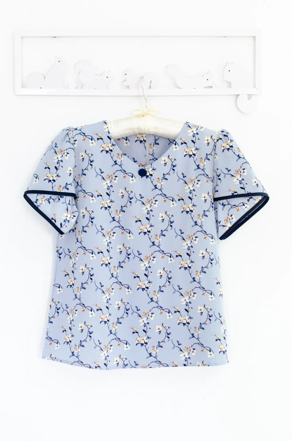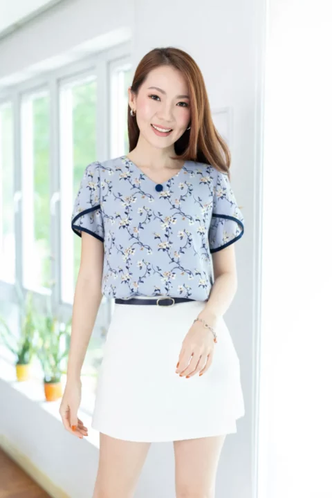 เสื้อทำงานคอวีแบบป้านโค้งๆ แต่งกระดุมปั๊ม 1 เม็ดด้านหน้า แขนสั้นซ้อนกุ๊นปลายแขนสีพื้น ด้านหลังผ่าหยดน้ำติดกระดุมคอ ใช้ผ้าไหมอิตาลีพิมพ์ลายดอกไม้ ผ้าเนื้อเนียนนิ่มรีดง่ายแห้งไว รุ่นนี้คอดใต้อกเล็กน้อยนะคะ