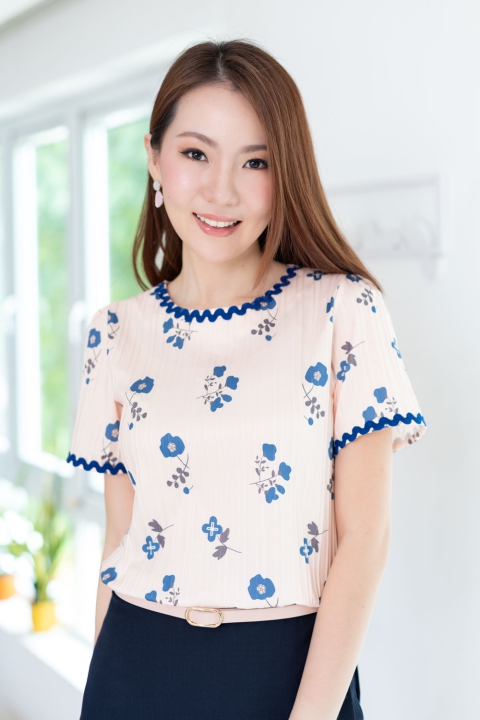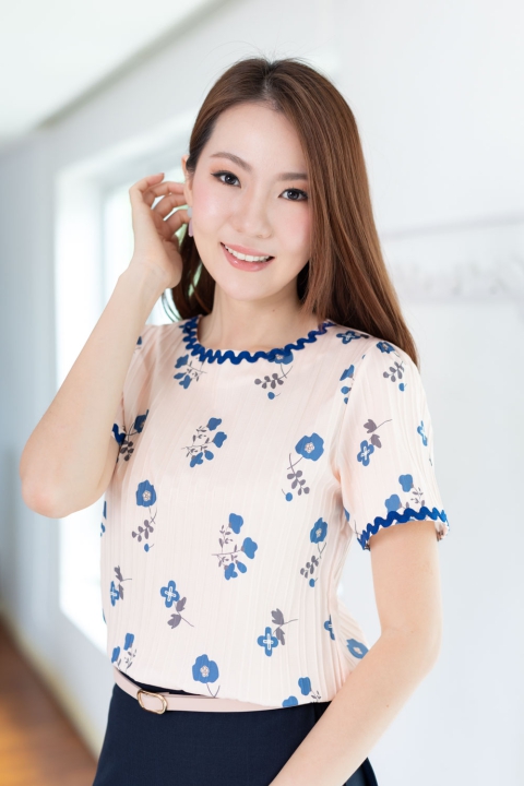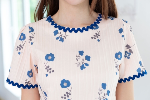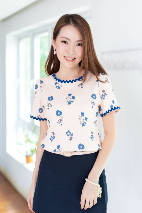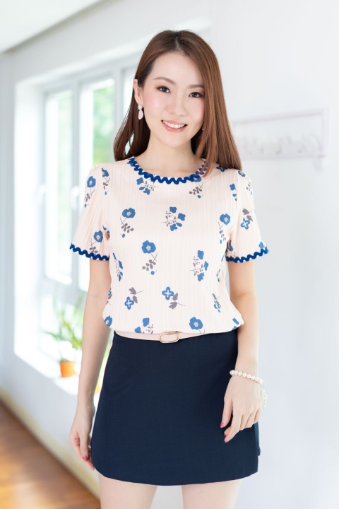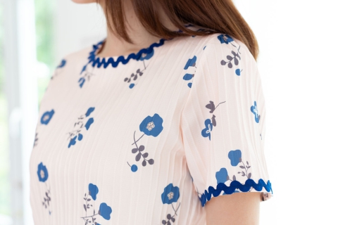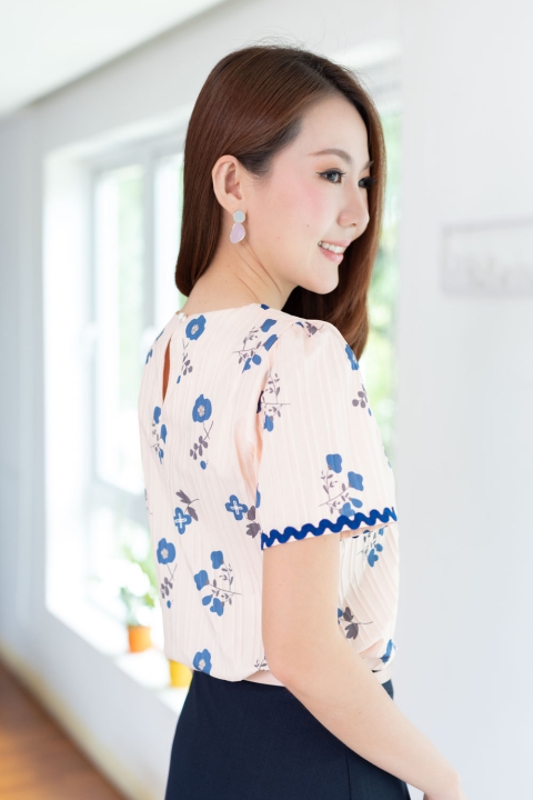 เสื้อคอกลมแขนสั้น ต้นแขนจับจีบดูหวานๆ ใช้ผ้าอัดลายนูนๆเป็น Texture ลายริ้วพิมพ์ลายดอกไม้ ผ้าไม่หนามากเนื้อแอบยืดหยุ่นนิดๆ ตกแต่งด้วยแถบลูกไม้โค้งหยักรอบคอและปลายแขน ด้านหลังผ่าหยดน้ำติดกระดุมคอ ทรงใส่ง่าย สวยแบบมีกิมมิค