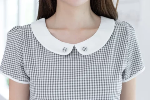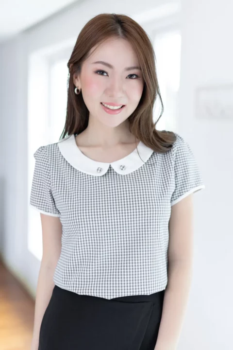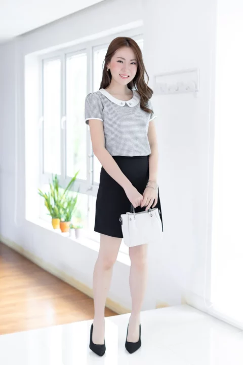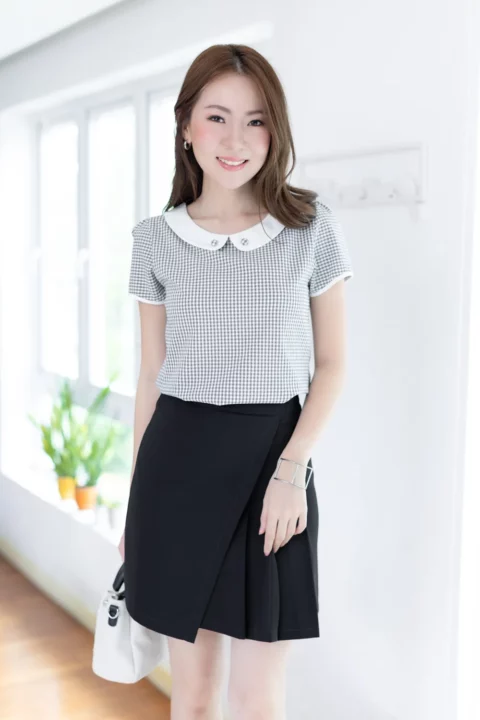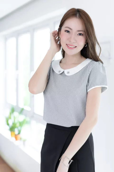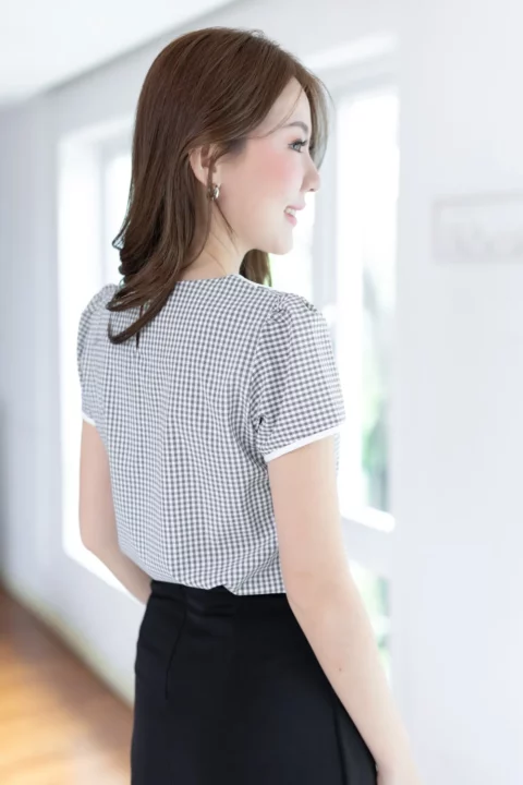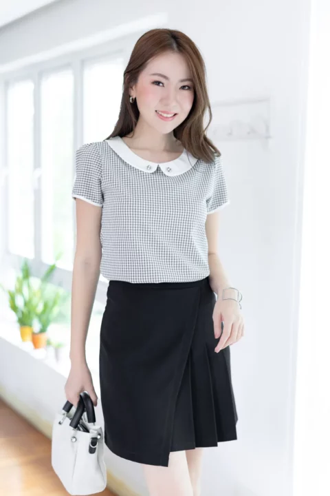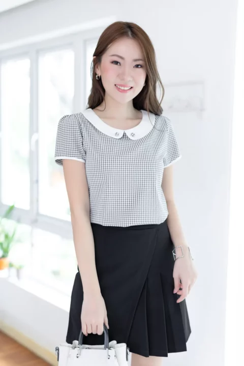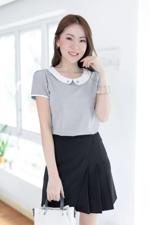 เสื้อทำงานแบบเก๋ เรียบร้อยด้วยปกบัวสีพื้น แต่งกระดุมปั๊ม แขนตุ๊กตาสั้นกุ๊นปลายแขน แพทเทิร์นคอดใต้อกช่วงตัวทรงเข้ารูปกว่าปกติ ด้านหลังผ่าหยดน้ำติดกระดุม คงคอนเซปความน่ารักด้วยลายตารางเล็ก ผ้าอัดย่นๆไม่หนามาก ดูแลง่ายแห้งไวค่ะ