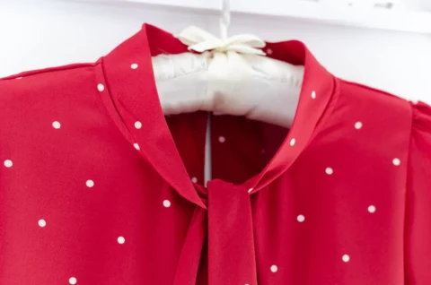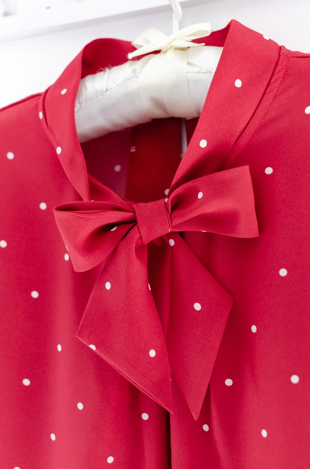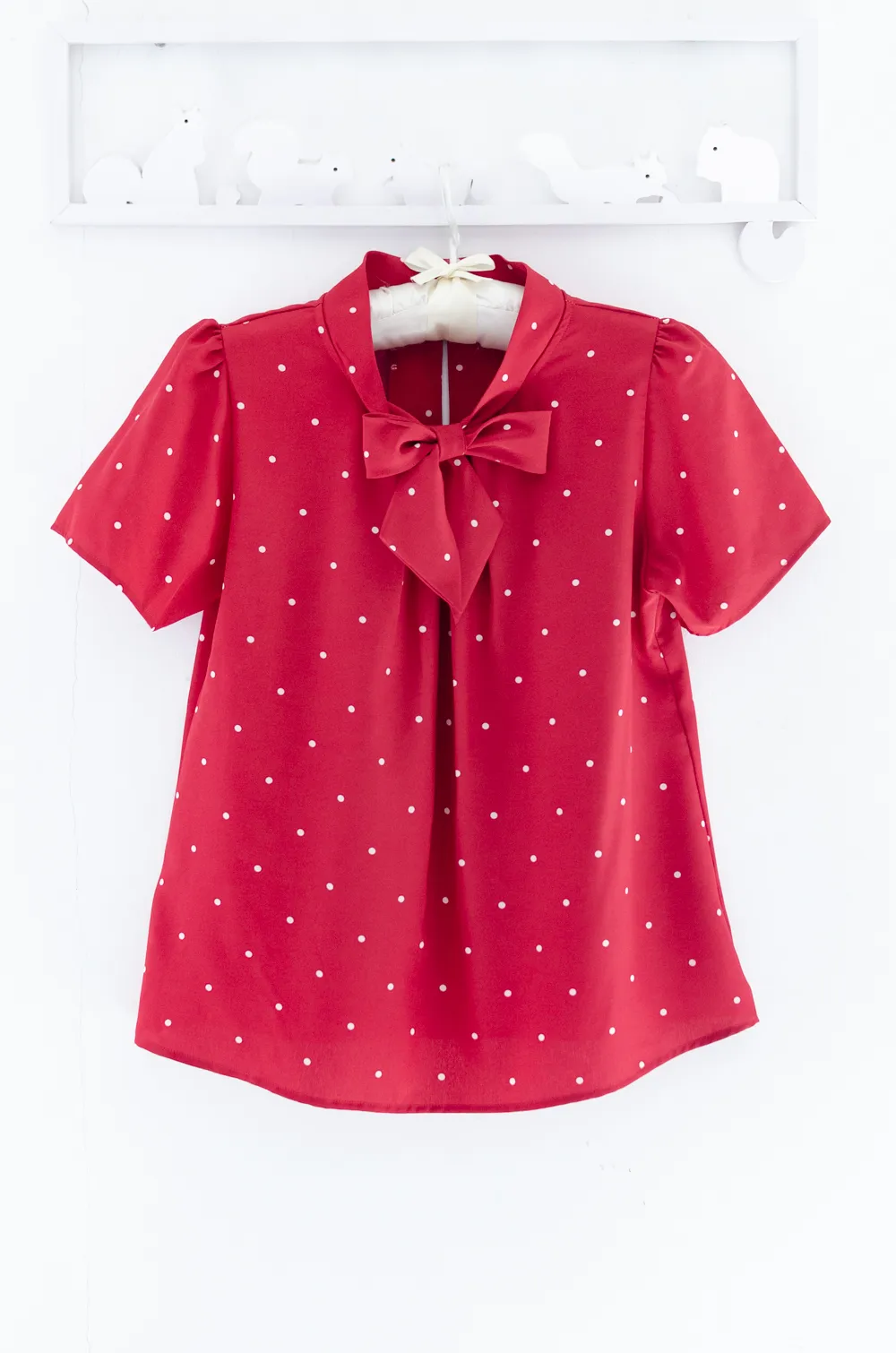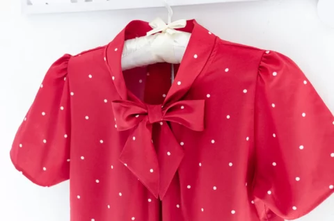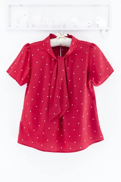 เสื้อแต่งสายผูกคอทรงเก๋ ใต้ปกด้านหน้าจับจีบซ้อน แขนสั้น ด้านหลังผ่าหยดน้ำติดกระดุมคอ เนื้อผ้านิ่มเนียนและทิ้งตัว สัมผัสดีสบายผิว ผ้าไม่โปร่งแสงแต่ไม่หนาเกินไป