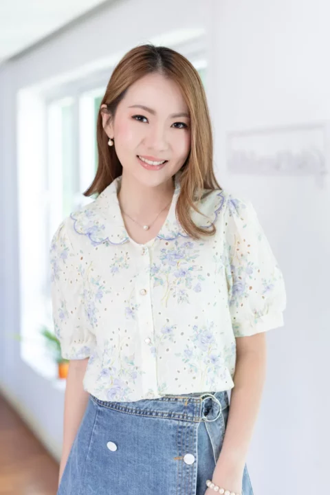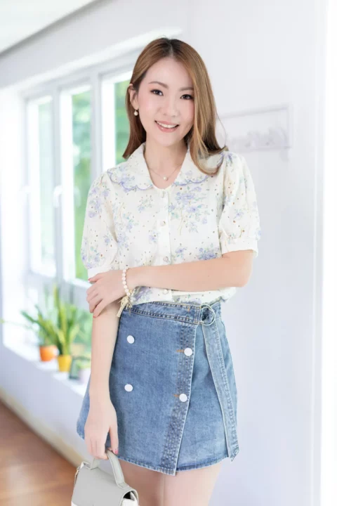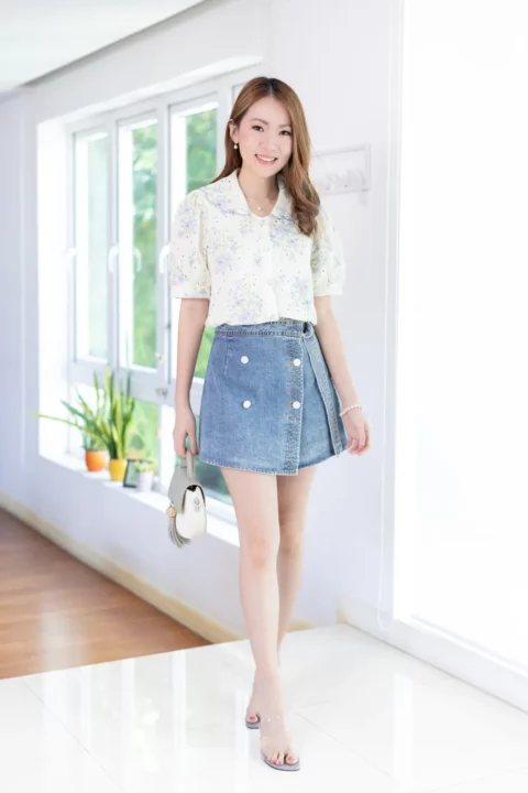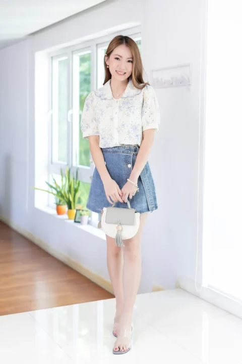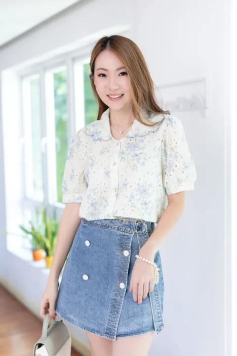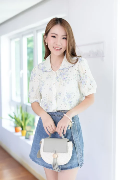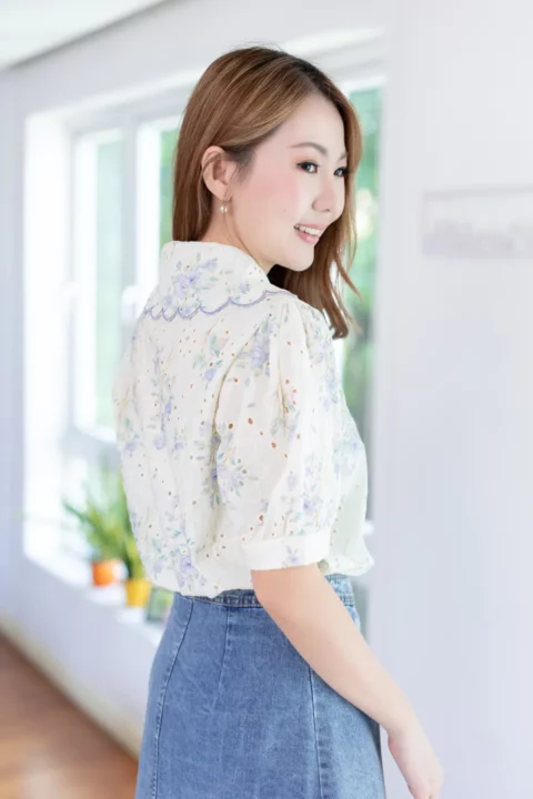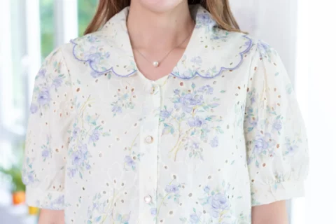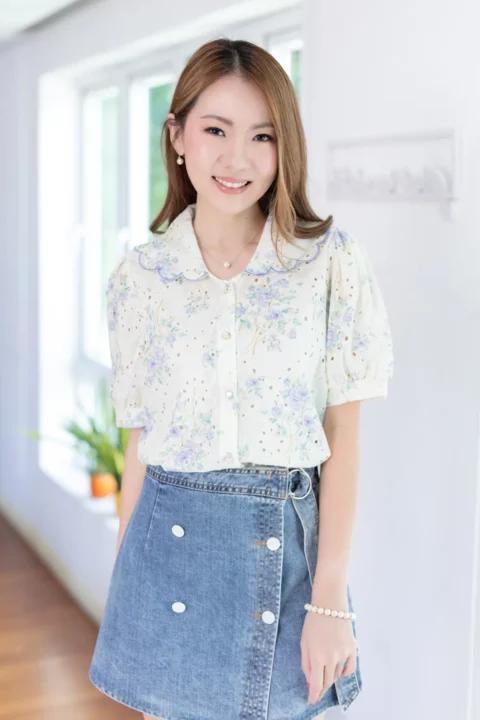 เชิ้ตทรงสั้น งานหวานเอยหวานใจ ใช้ผ้าคอตตอนพิมพ์ลายดอกไม้แล้วปักฉลุลาย ปกเสื้อแต่งหยักน่ารักๆ แขนสั้นทรงบอลลูน จับคู่กระโปรงผ้าหรือกางเกงสบายๆก็จะน่ารักมากเลย พร้อมไปคาเฟ่ หรือใส่คู่ยีนส์ก็แอบเก๋ พร้อมไปเที่ยวแล้ว หวานยืนหนึ่งค่า