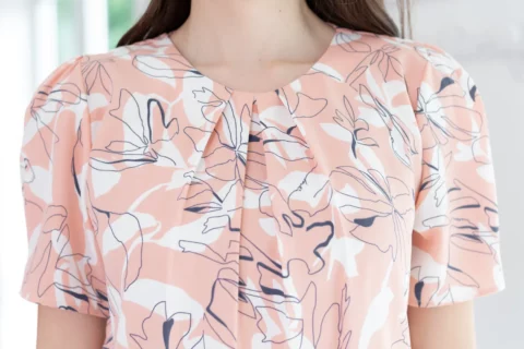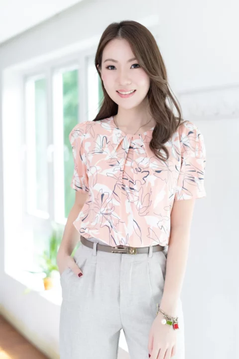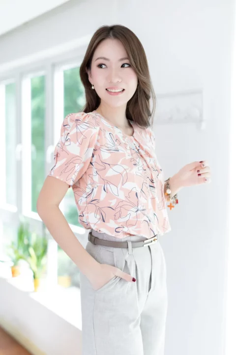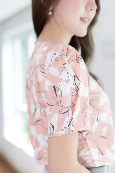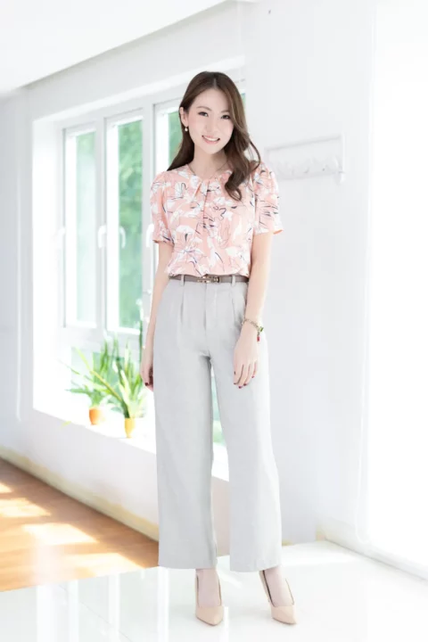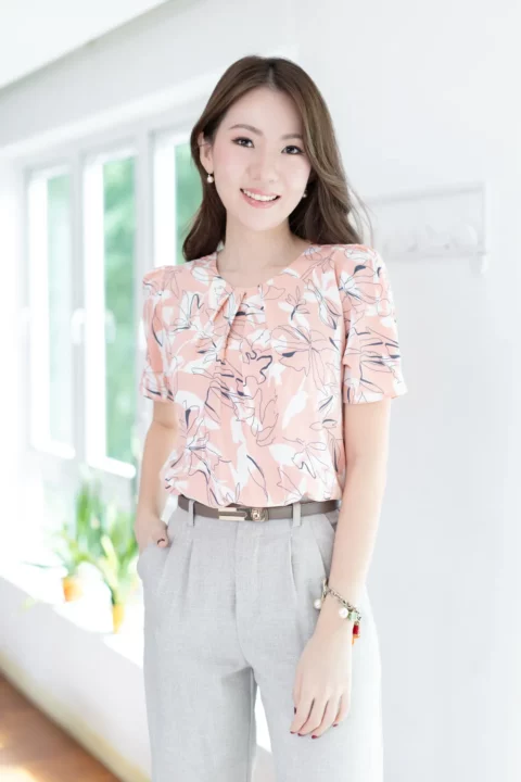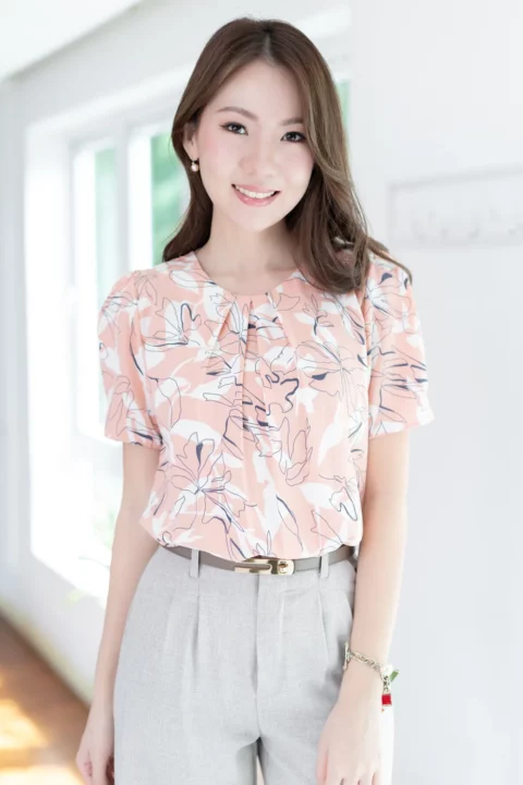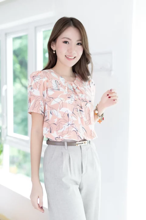 เสื้อคอกลมเนี้ยบๆ จับพลีทพับซ้อนด้านหน้า แขนจับจีบปลายต้นแขนพองนิดๆ ทรงนี้คลาสซี่มากค่ะ ใช้ผ้าไหมอิตาลีเนื้อดีเหมือนเดิมค่ะ ลายพิมพ์ดอกไม้เรียบหรูดูดี