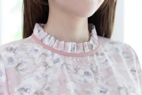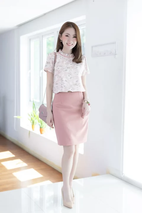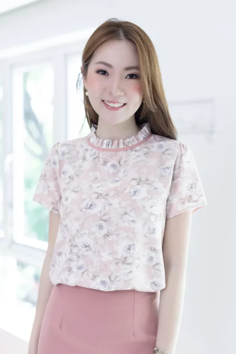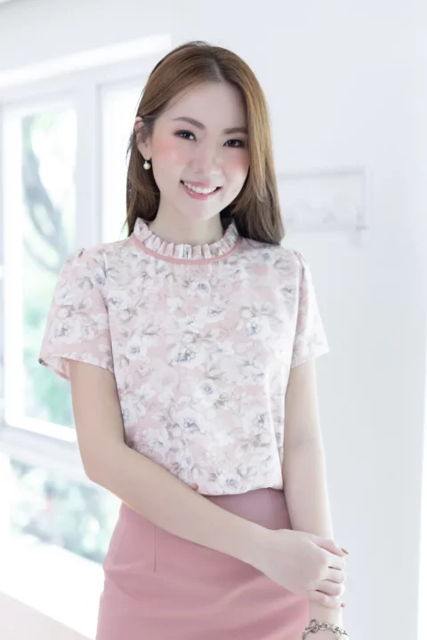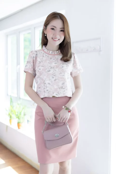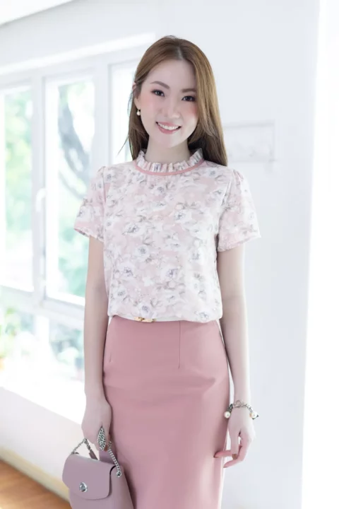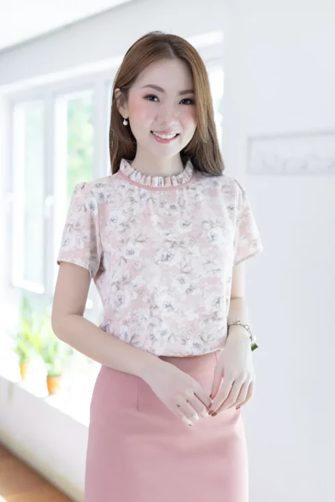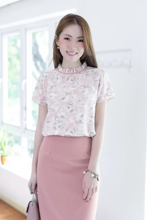 เสื้อทำงานคอจีบตั้งหวานๆ แต่งกุ๊นสีพื้นเข้ากันกับลายผ้า เนื้อผ้าไหมอิตาลีพิมพ์ลายดอกไม้ แขนสั้น ด้านหลังผ่าหยดน้ำสวมใส่สะดวก