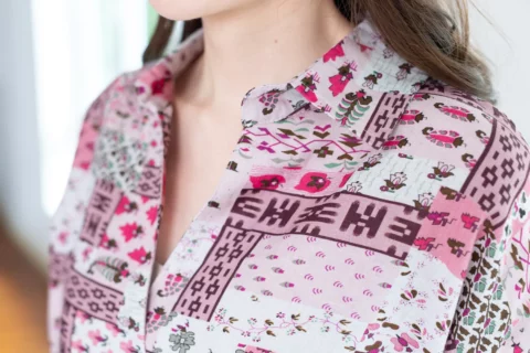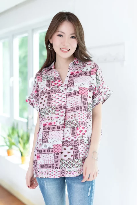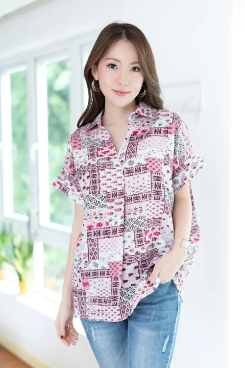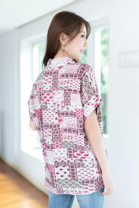 เสื้อลินินเนื้อเด้ง คอแต่งปก ผ่าวีแบบซ้อนด้านหน้า แขนค้างคาว(แขนล้ำ)พับปลายแขน ทรง Oversized ใส่หลวมๆปล่อยๆโชว์ลายผ้าพิมพ์