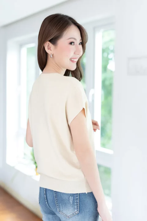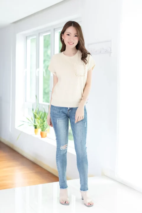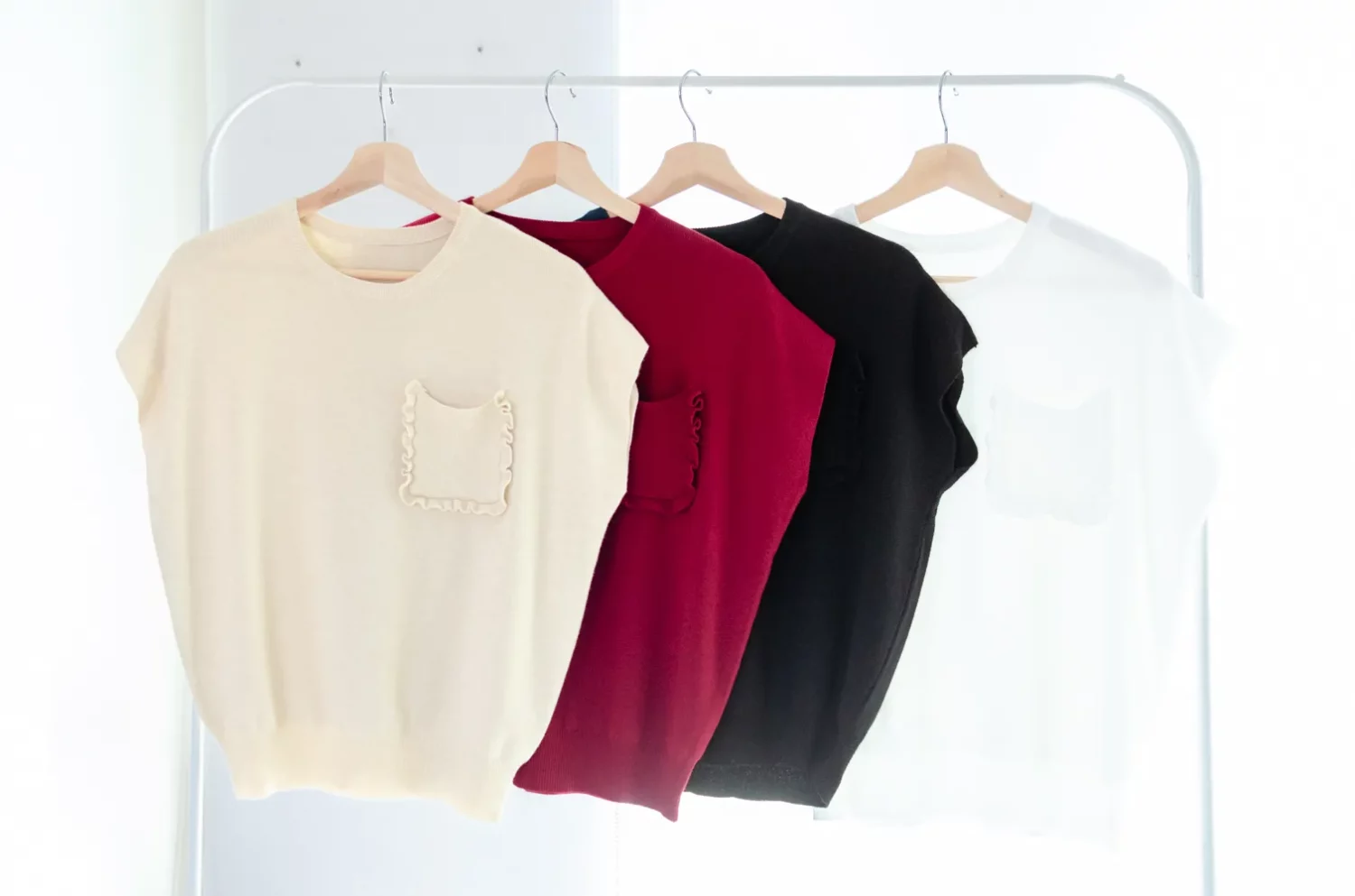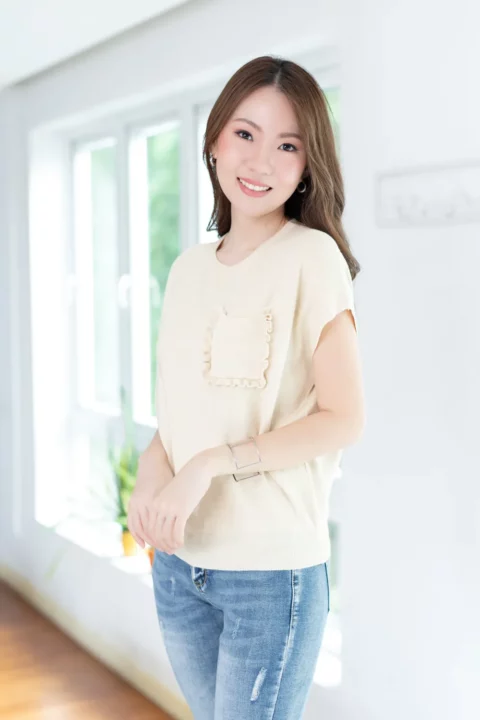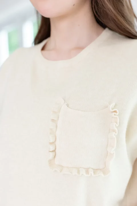 เสื้อไหมพรมนุ่มๆนิ่มๆ ทรงคอกลมแขนล้ำๆ จั๊มชายเสื้อ แต่งกระเป๋าจริงมีดีเทลระบาย เบสิคแต่แบบแอบน่ารัก ใส่สบ๊าย