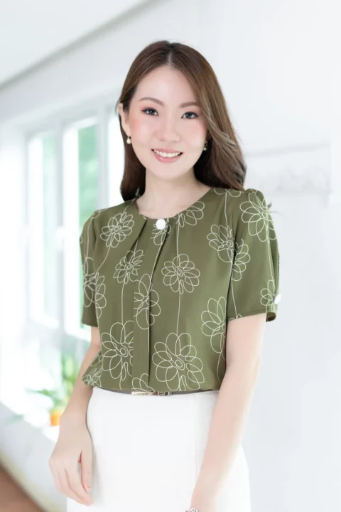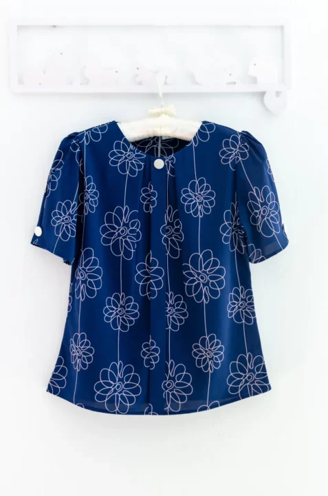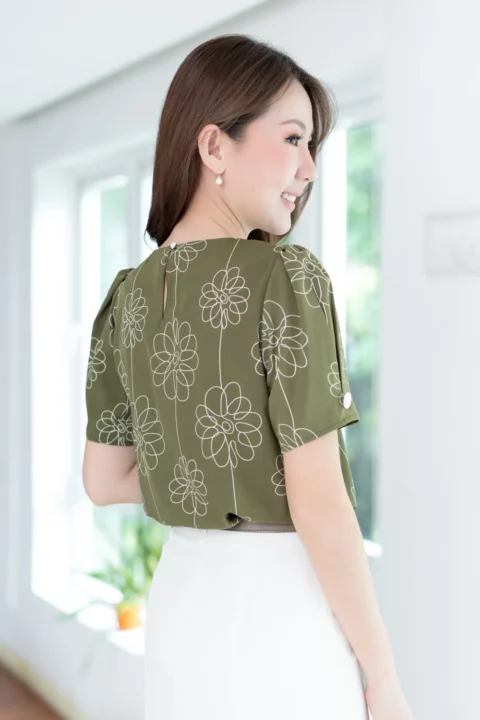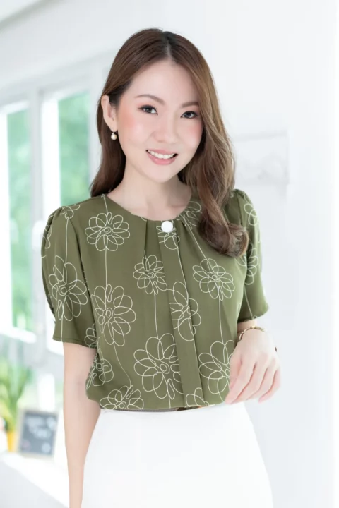 เสื้อคอกลมแต่งสาบหลอกด้านหน้ายาวพร้อมดีเทลจีบด้านข้างสาบ แขนไม่สั้นมาก จีบรูดต้นแขนจับจีบปลายแขน ทรงจะดูพองนิดๆ ประดับกระดุมปั๊มสีพื้นช่วงคอและปลายแขน ตัวผ้าเป็นเนื้อไหมอิตาลีนิ่มเนียน ยับยาก แห้งไว ดูแลง่าย