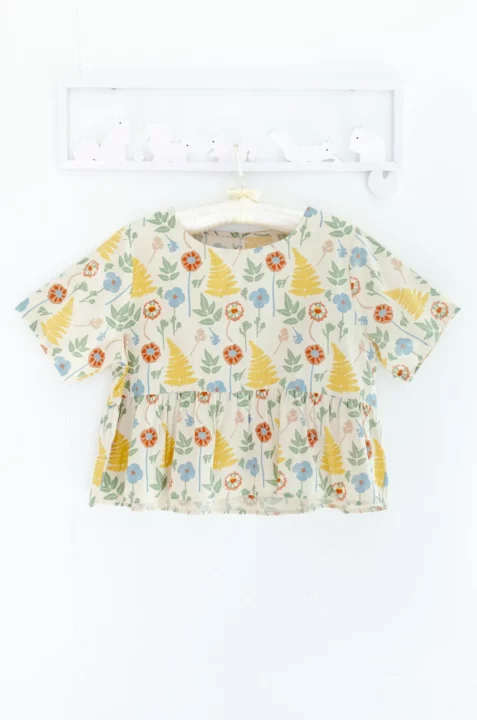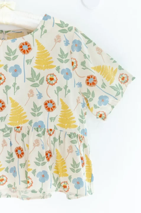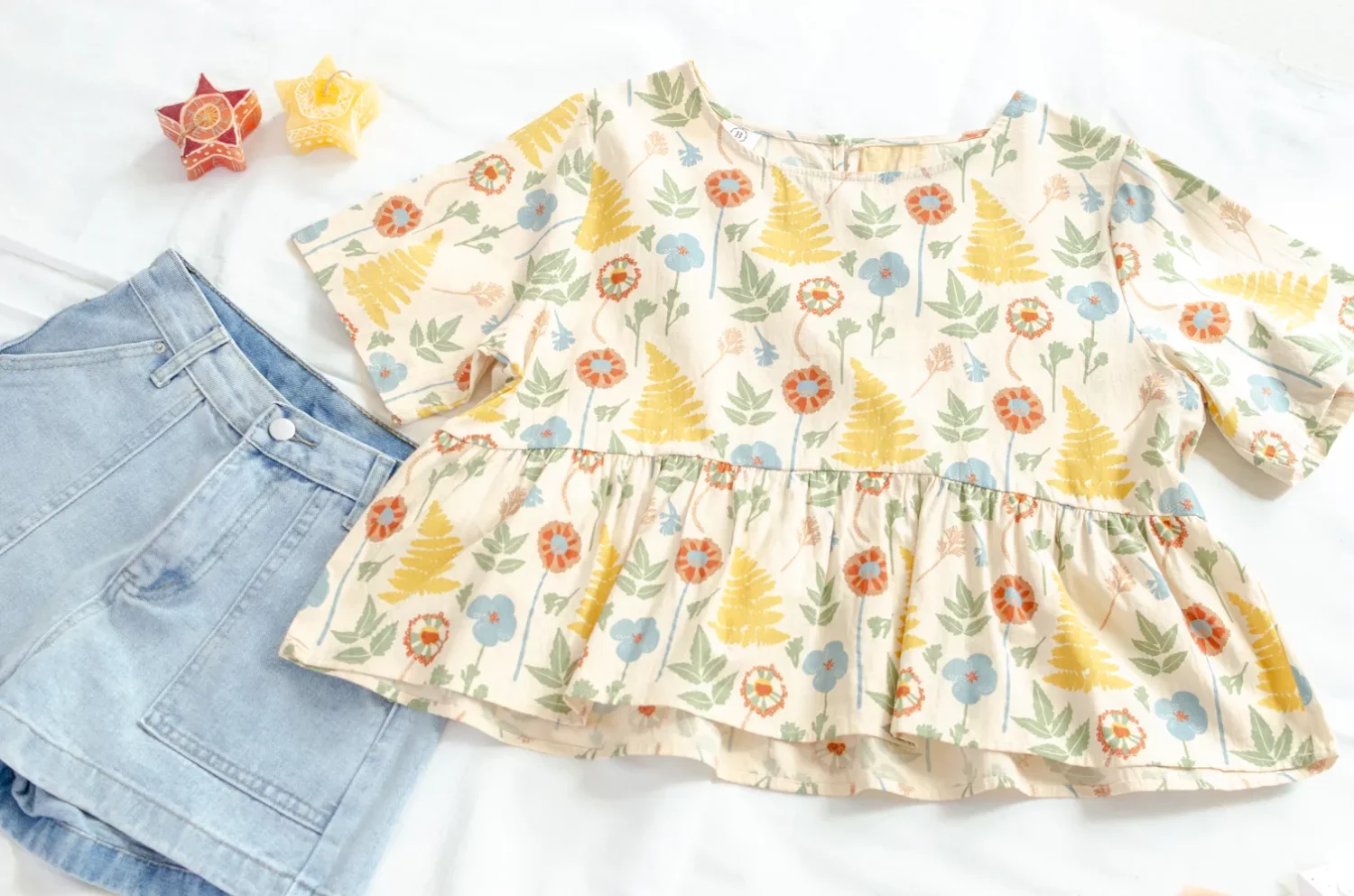 เสื้อคอตตอนที่ใส่แล้วเปล่งประกายด้วยความสดใส คอปาด ช่วงใต้อกต่อด้วยจีบรูด ปล่อยชายระบายบานๆ ด้านหลังคอผ่าหยดน้ำ ทรงเสื้อสั้นๆเหมาะสำหรับวีคเอนด์ แบบเรียบๆแต่ดูน่ารัก ลายพิมพ์ใบเฟิร์นสวยสดชื่น