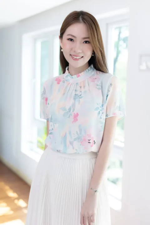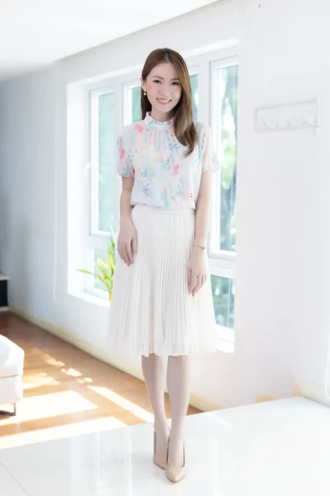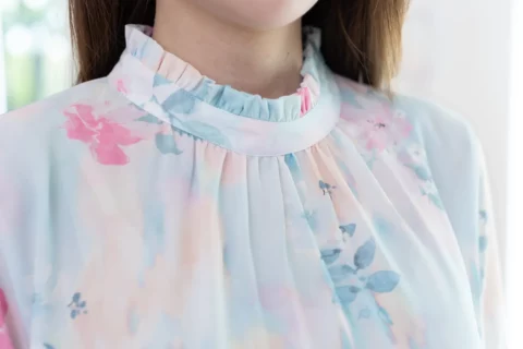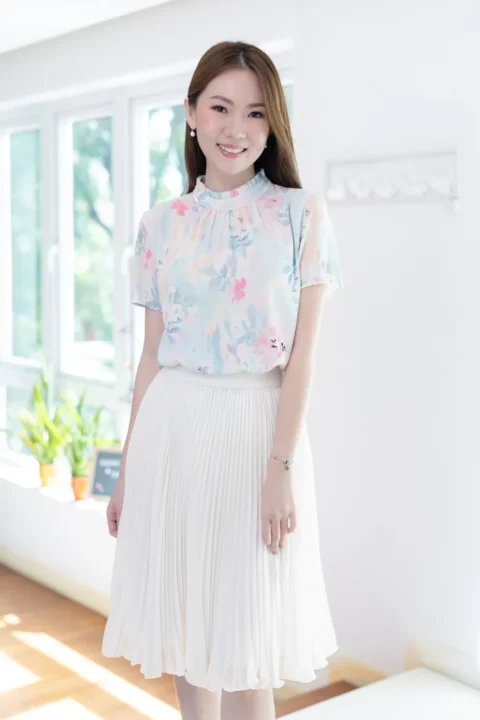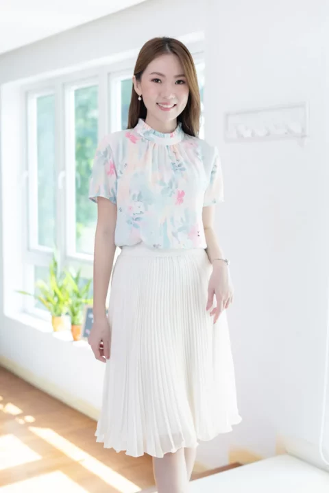 เสื้อคอปิดจับจีบตั้งๆกลับมาแล้วค่า เนื้อผ้าชีฟองพิมพ์ลายดอกไม้ ผ้าทิ้งตัวนิดๆ ตัวผ้าจะยังโปร่งแสงบางมุมยังแนะนำให้ใส่ซับในนะคะ ใต้คอจับจีบรูดเบาๆโชว์ความพลิ้วสวยของผ้า แขนสั้น ด้านหลังผ่าหยดน้ำติดกระดุม สาวกชีฟองถูกใจแน่นอนค่ะ